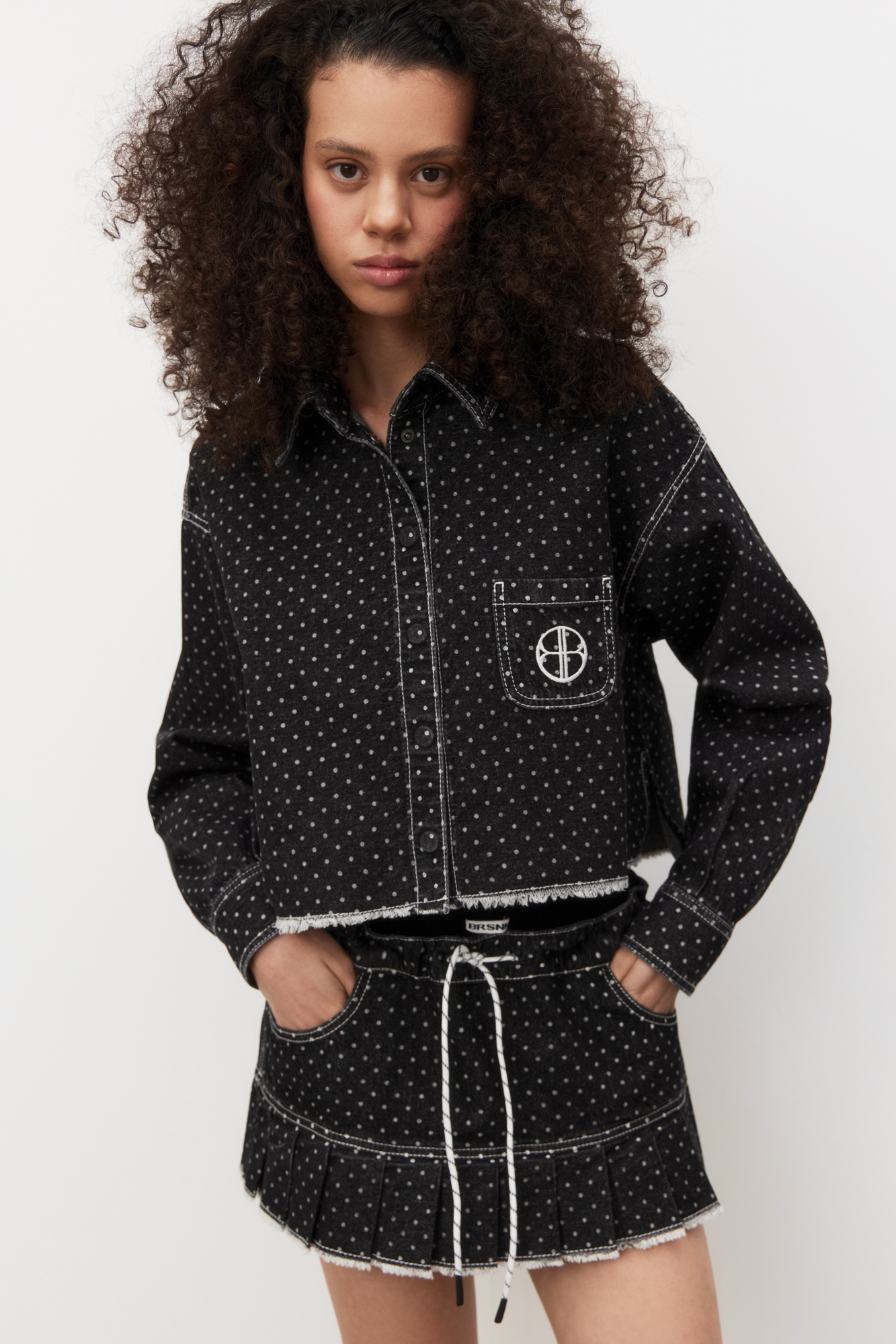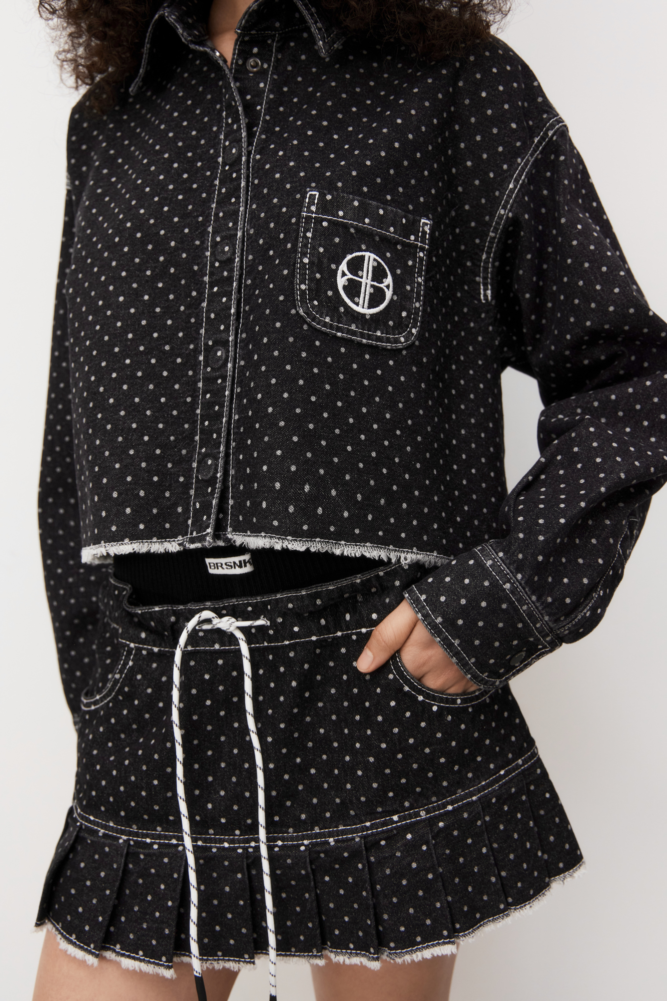 Джинсовая юбка в горошек длины мини из 100% хлопка. Модель выполнена в складку, с поясом на кулиске и двумя карманами. Изделие декорировано строчкой контрастного цвета и имитацией необработанного края. Трикотажные вискозные шорты с жаккардовой надписью в комплекте.