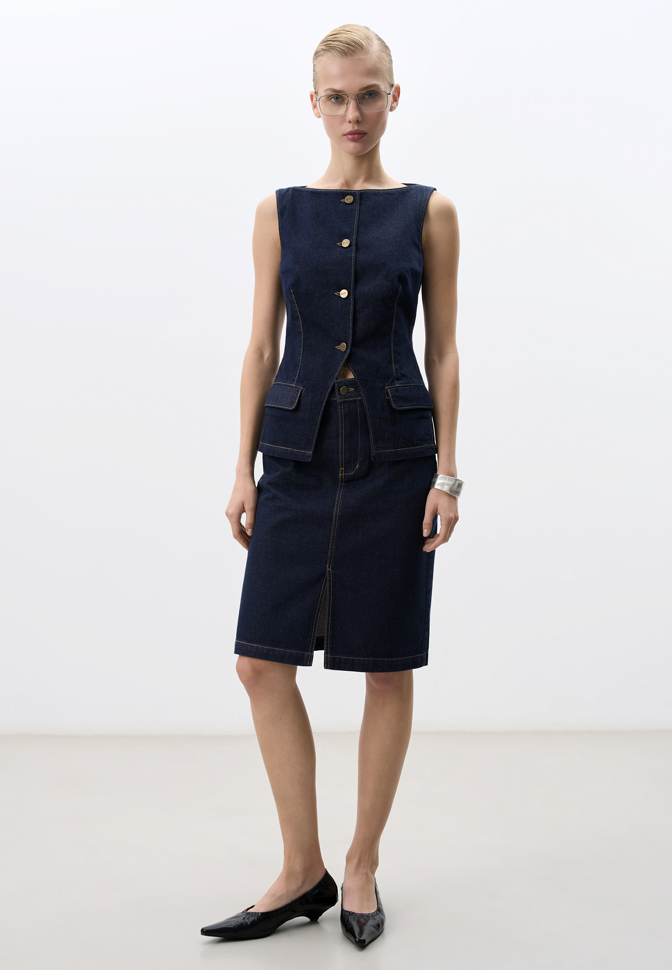 Джинсовая юбка длины миди из 100% хлопка. Модель прямого кроя, с карманами, шлевками на поясе для ремня и невысоким разрезом спереди. Застежка на молнию и пуговицу. Дополнить образ можно жакетом или жилетом.
