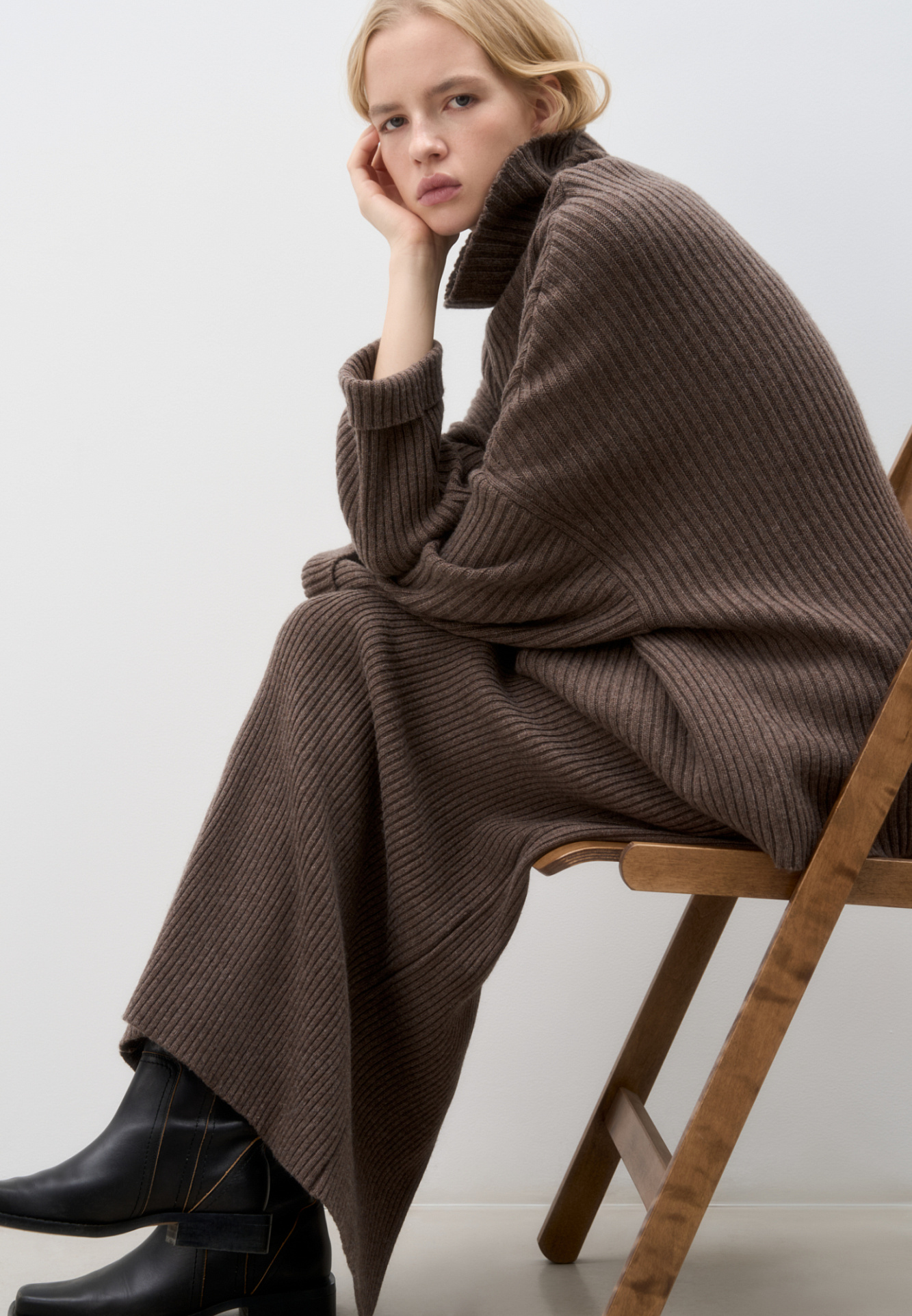 Трикотажная юбка длины макси из кашемира и шерсти. Модель приталенного силуэта, с разрезом сзади и эластичным поясом. Изделие выполнено в рубчик.