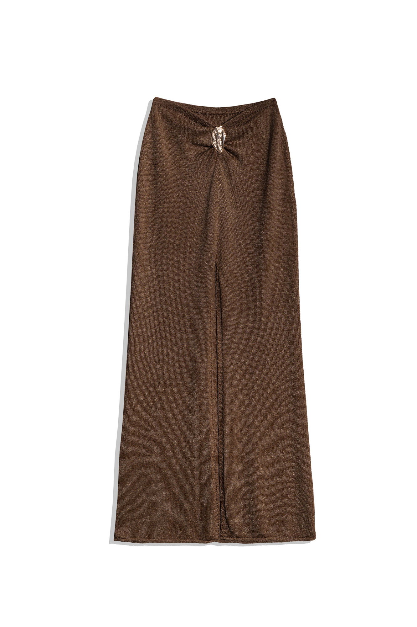 Трикотажная юбка длины макси из вискозы с люрексом. Модель с высоким разрезом спереди, валиком на подоле и акцентным элементом на поясе.