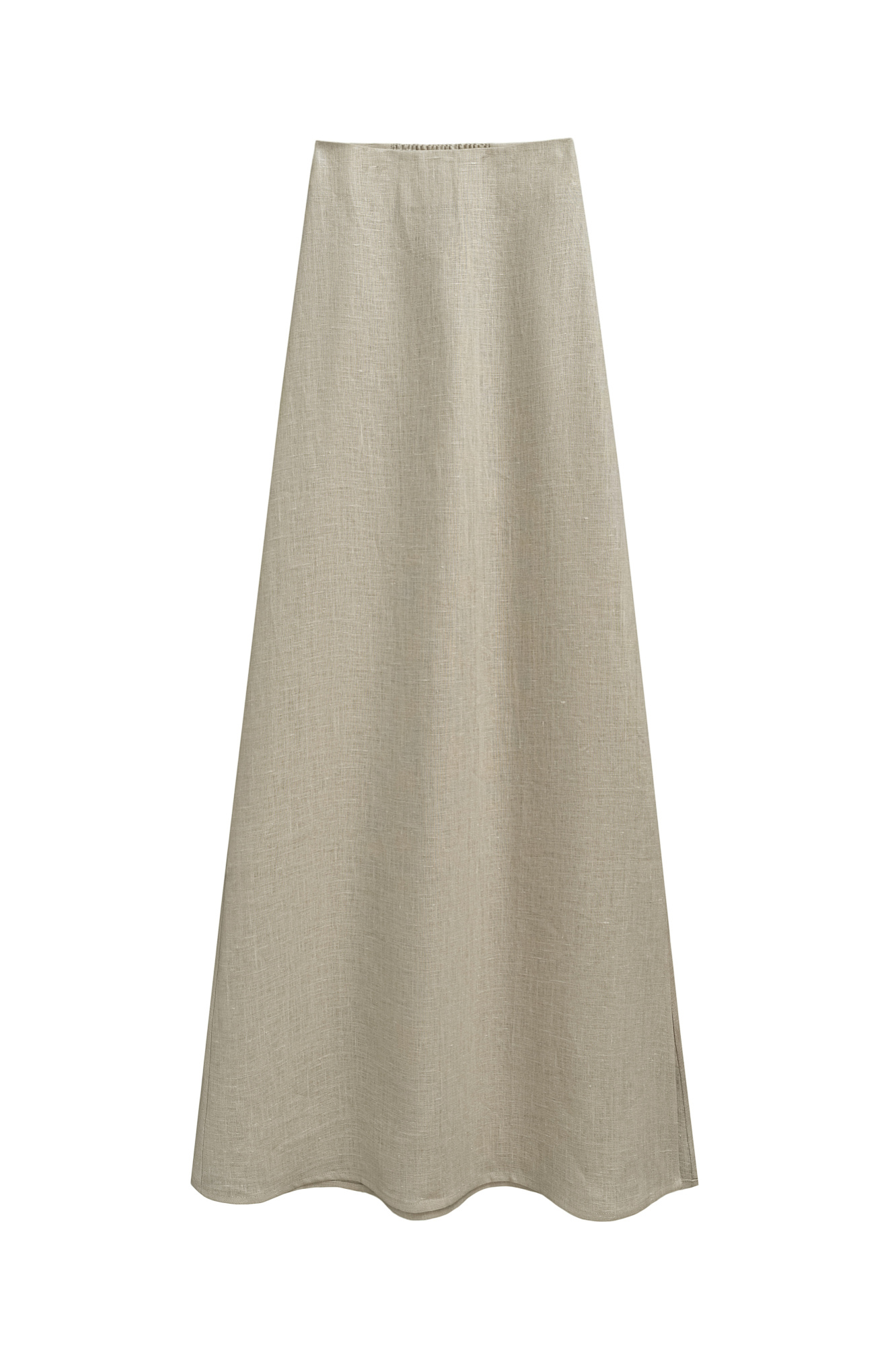 Юбка длины макси из 100% льна. Модель прямого кроя, с небольшим разрезом сбоку, эластичным поясом на резинке и застежкой на молнию.