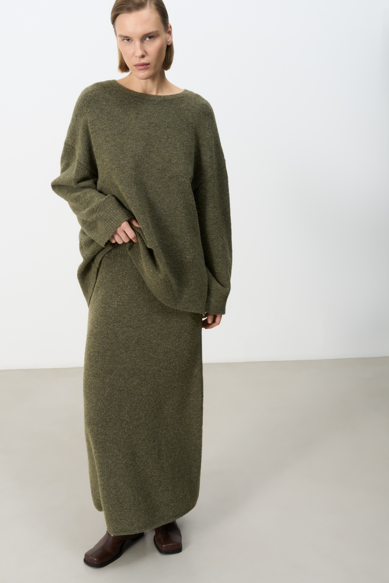 Трикотажная юбка длины макси с небольшим расклешением к низу, изготовленная из смесовой шерсти. Пояс изделия выполнен в виде эластичной резинки в рубчик. Дополнить образ можно джемпером в таком же стиле.