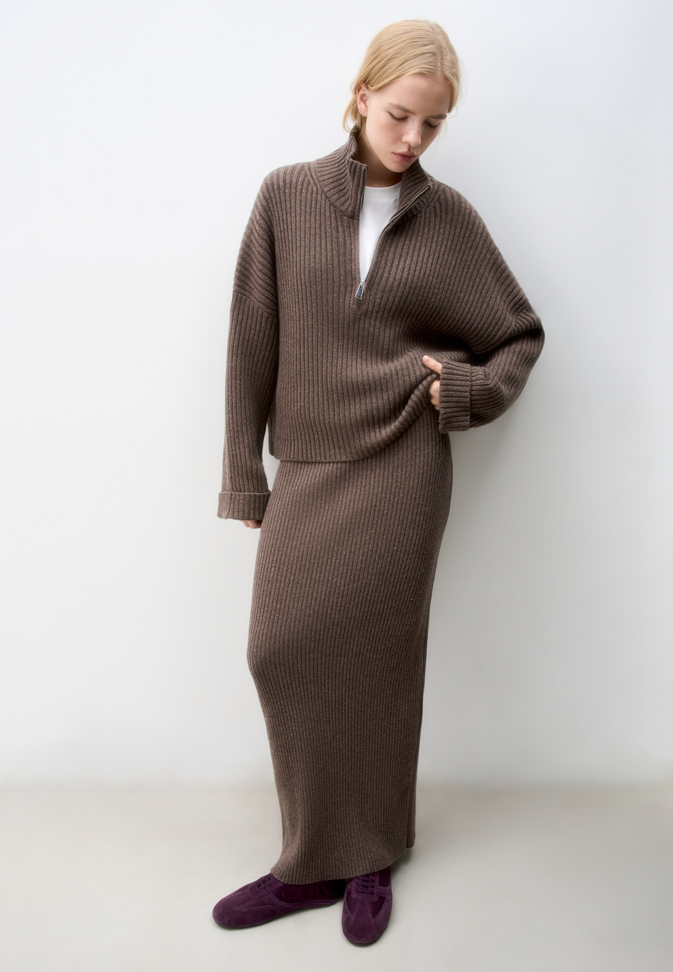Трикотажная юбка длины макси из кашемира и шерсти. Модель приталенного силуэта, с разрезом сзади и эластичным поясом. Изделие выполнено в рубчик.