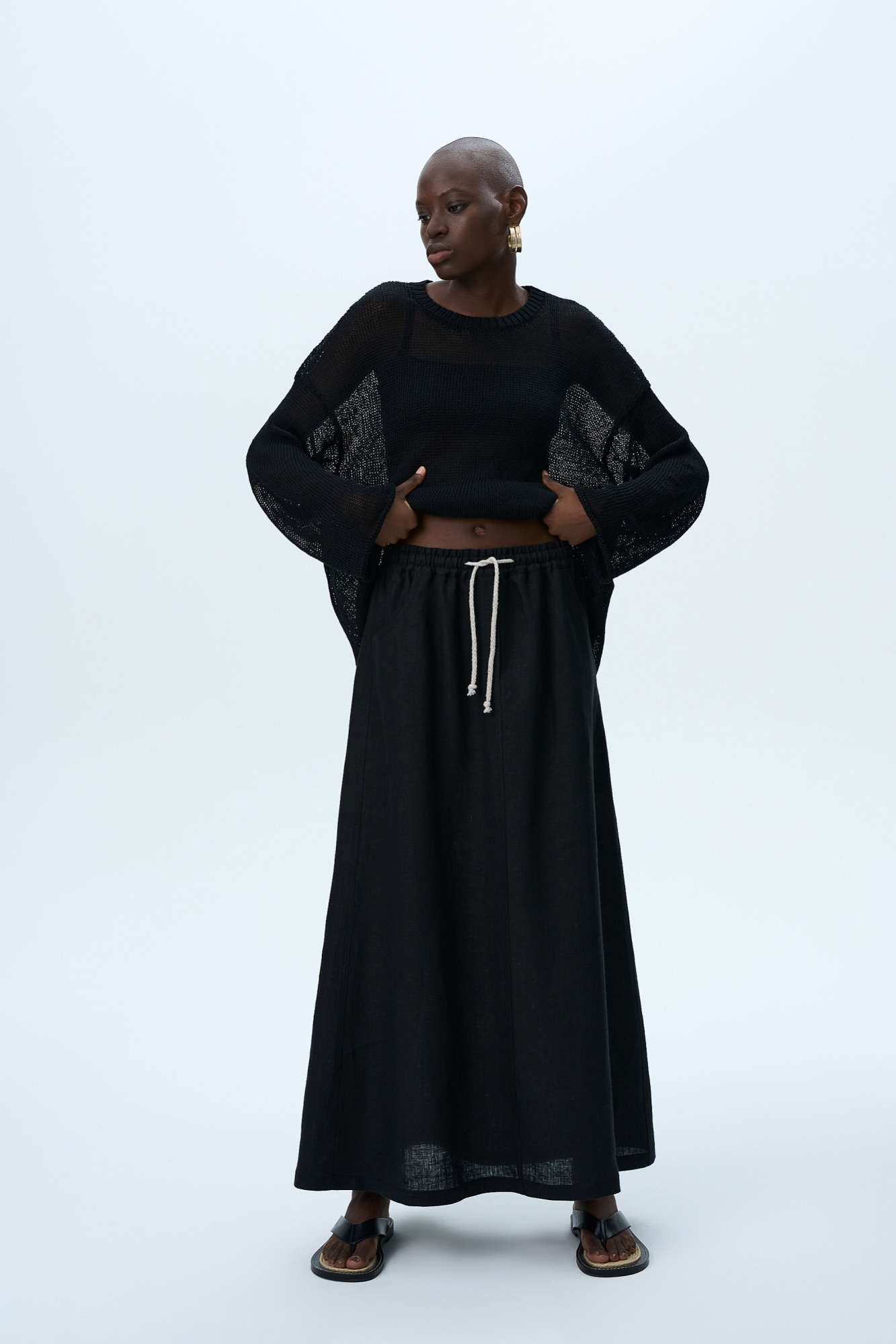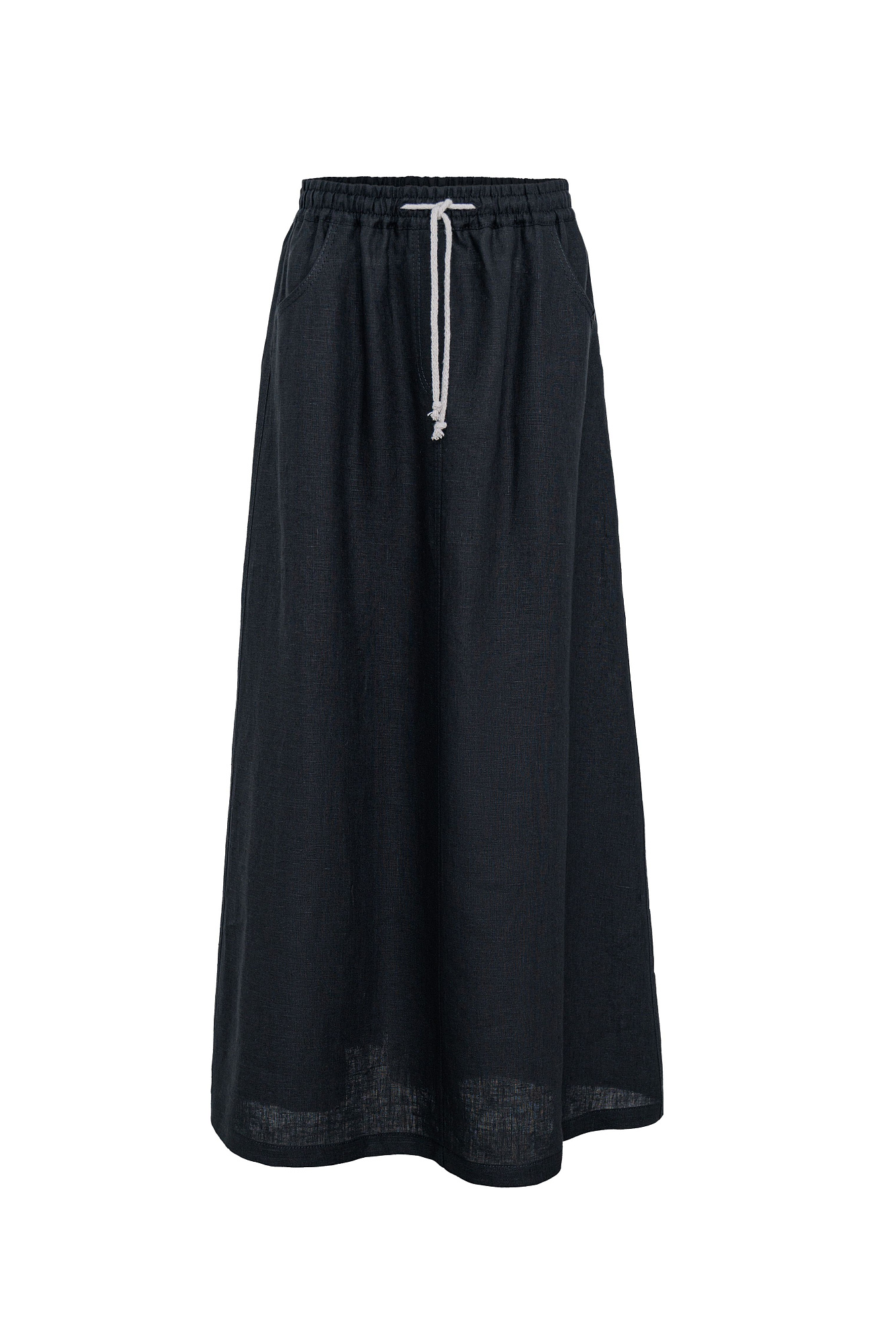 Юбка длины макси из 100% льна. Модель свободного силуэта с эластичным поясом на кулиске и боковыми карманами. Дополнить образ можно топом в том же стиле.