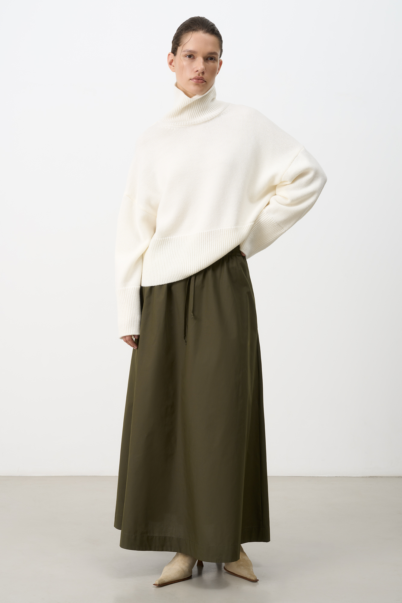 Хлопковая юбка длины макси. Модель прямого кроя, с эластичным поясом на кулиске и карманами.