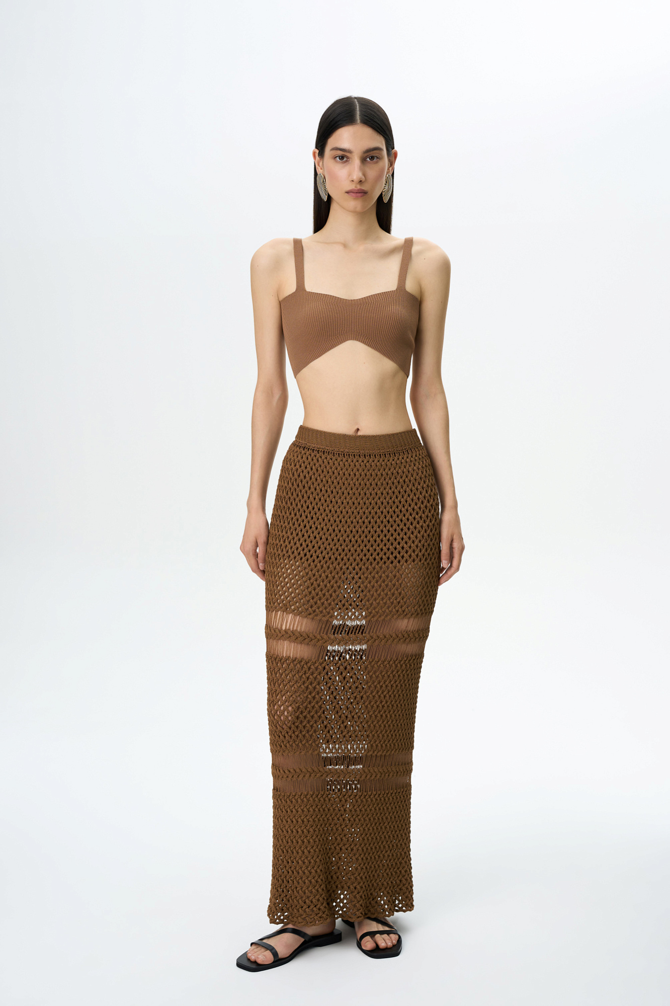 Трикотажная юбка длины макси. Модель приталенного силуэта, выполненная сложным ажурным переплетением с протяжками.