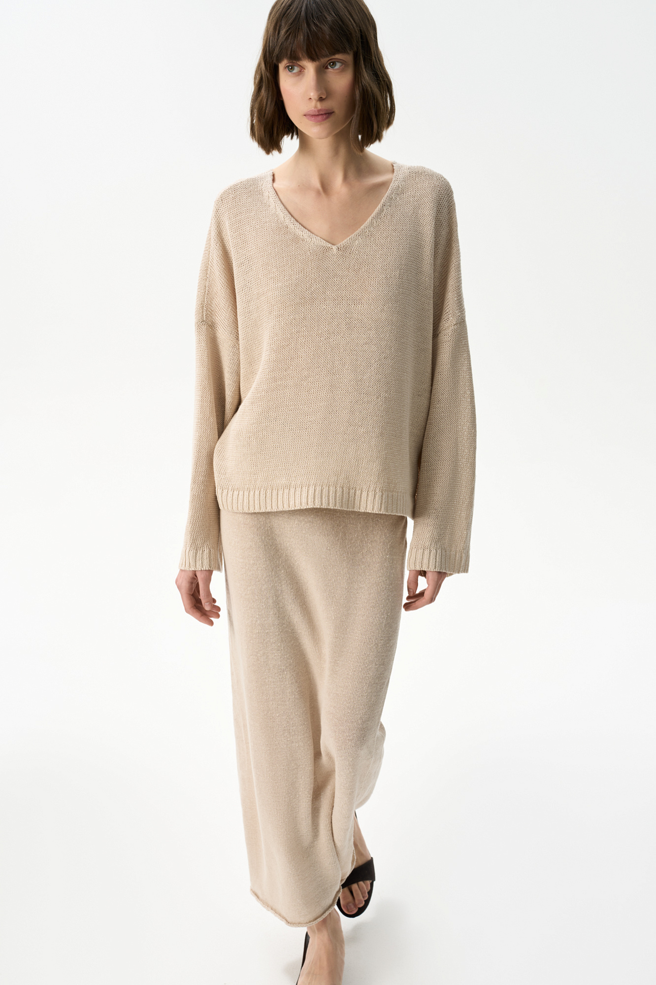 Трикотажная юбка длины макси из 100% льна. Модель свободного силуэта с эластичным поясом в рубчик на кулиске.