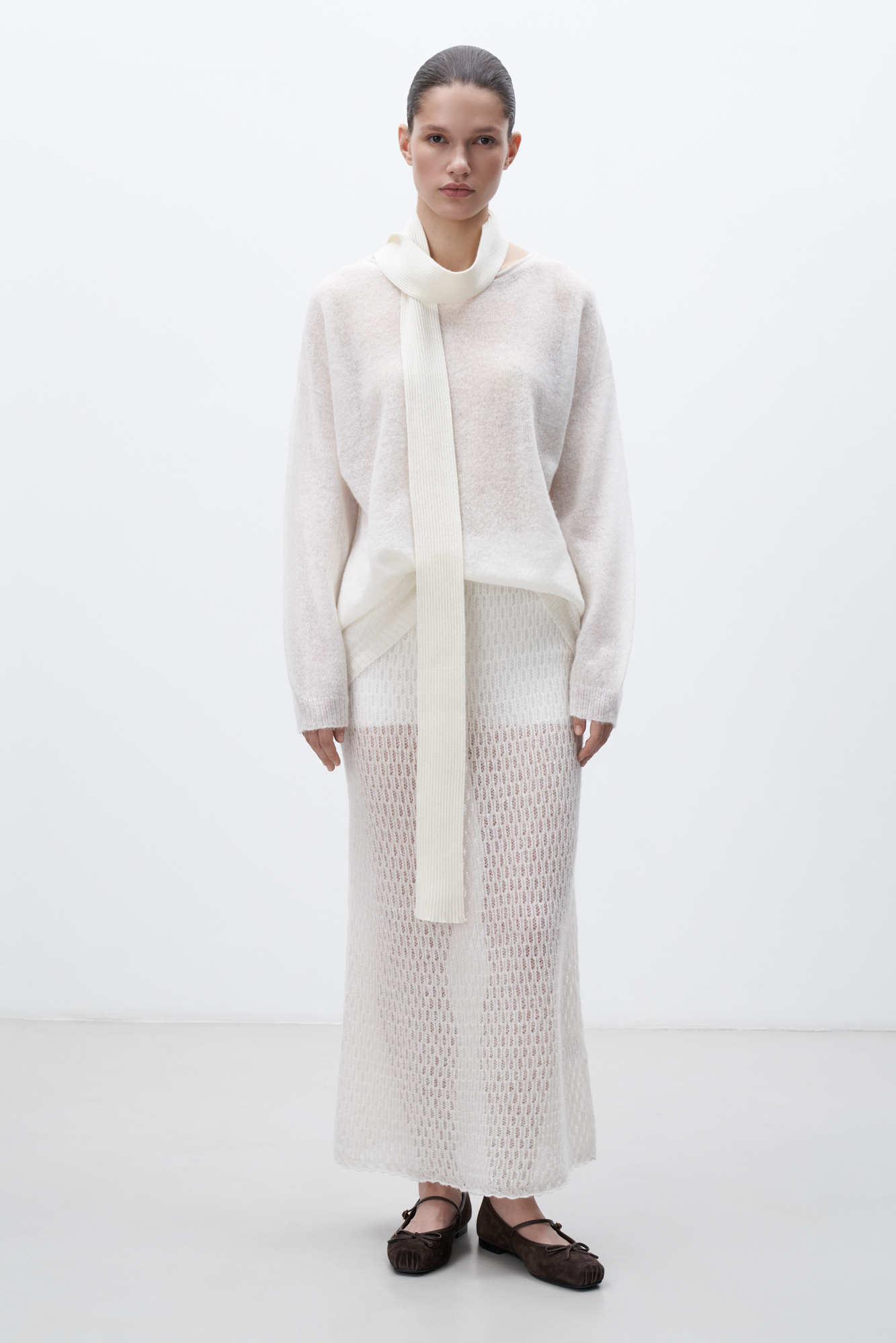 Ажурная юбка длины макси из шерсти мериноса с добавлением шерсти альпака. Эластичный пояс в рубчик. Без подкладки.