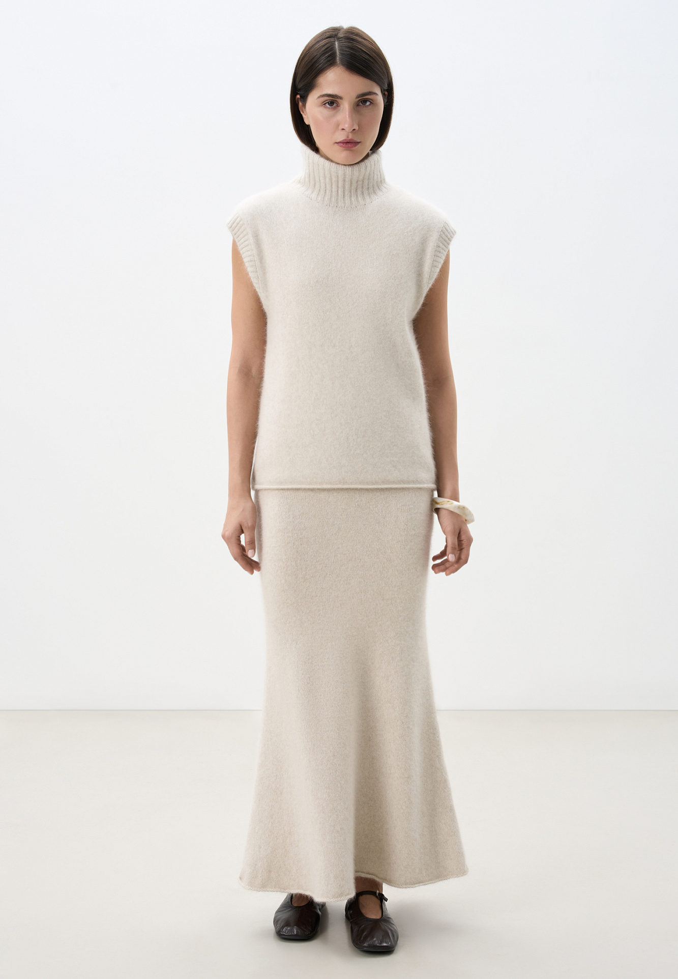 Трикотажная юбка длины макси из пуха лисы. Модель А-силуэта, с эластичным поясом на резинке и валиком по низу подола. Дополнить образ можно джемпером в таком же стиле.