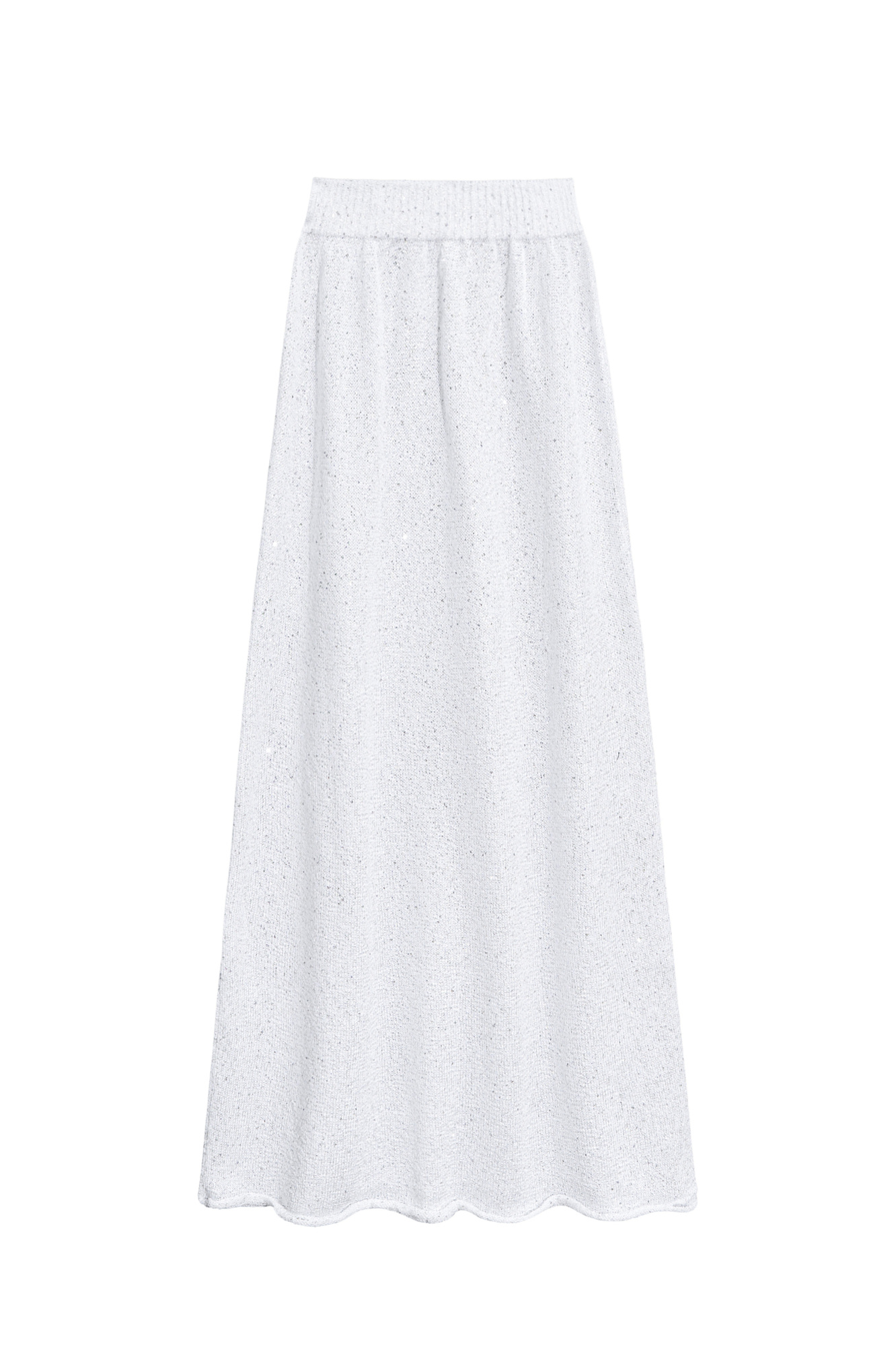 Трикотажная юбка длины макси из хлопка с добавлением вискозы. Модель А-силуэта, с широким эластичным поясом на резинке. Изделие декорировано маленькими пайетками.