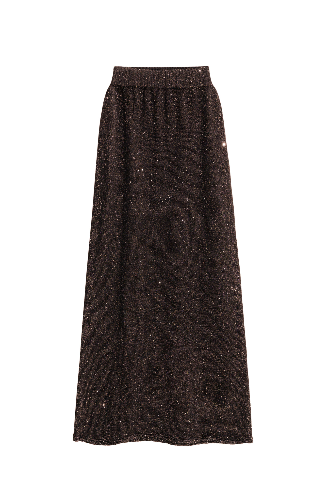 Трикотажная юбка длины макси из хлопка с добавлением вискозы. Модель А-силуэта, с широким эластичным поясом на резинке. Изделие декорировано маленькими пайетками.