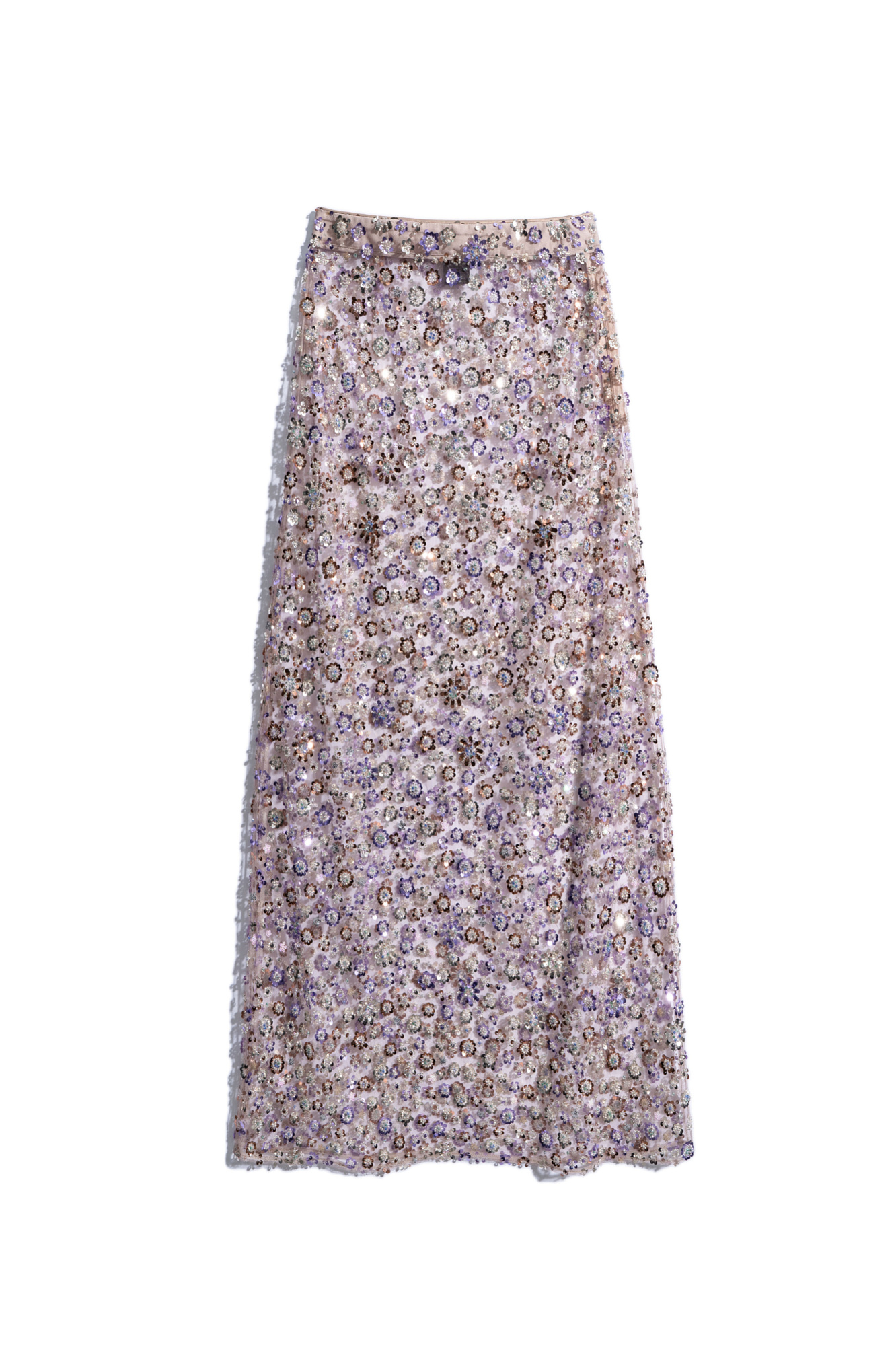 Юбка длины макси с цветочным орнаментом, вышитым пайетками и бисером. Застежка на потайную молнию. Изделие без подкладки.