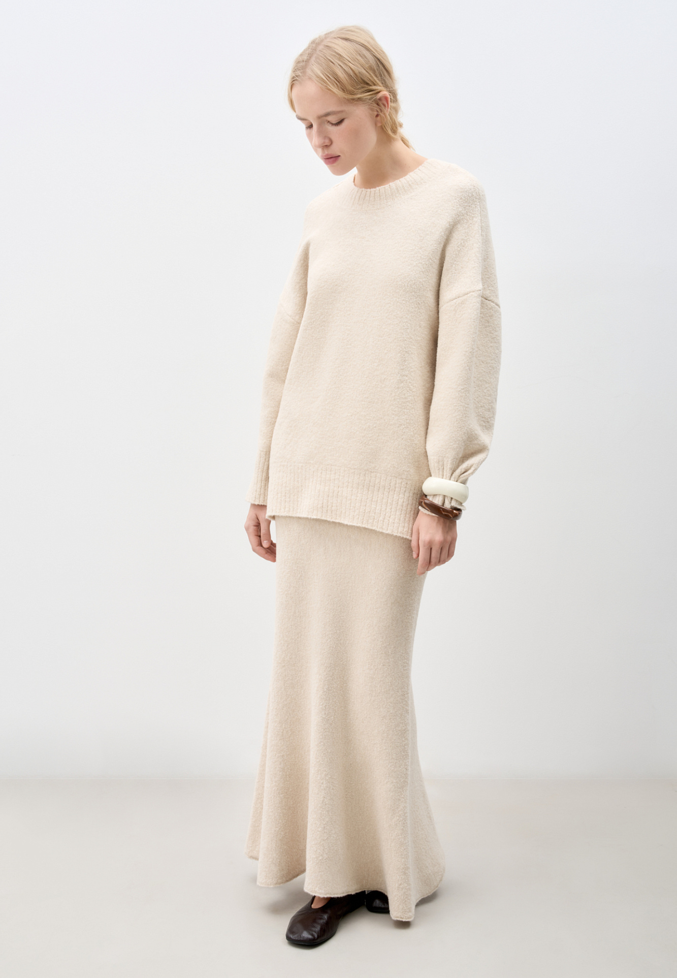 Трикотажная юбка длины макси из буклированной пряжи. Модель по фигуре с расклешенным подолом и поясом, дополненным кулиской. Дополнить образ можно джемпером в таком же стиле.