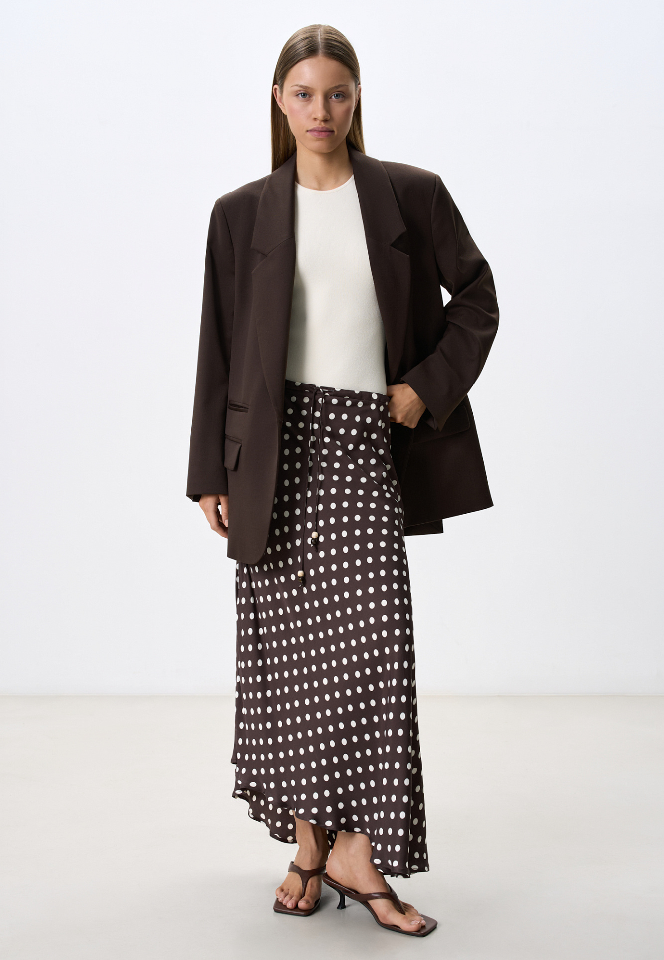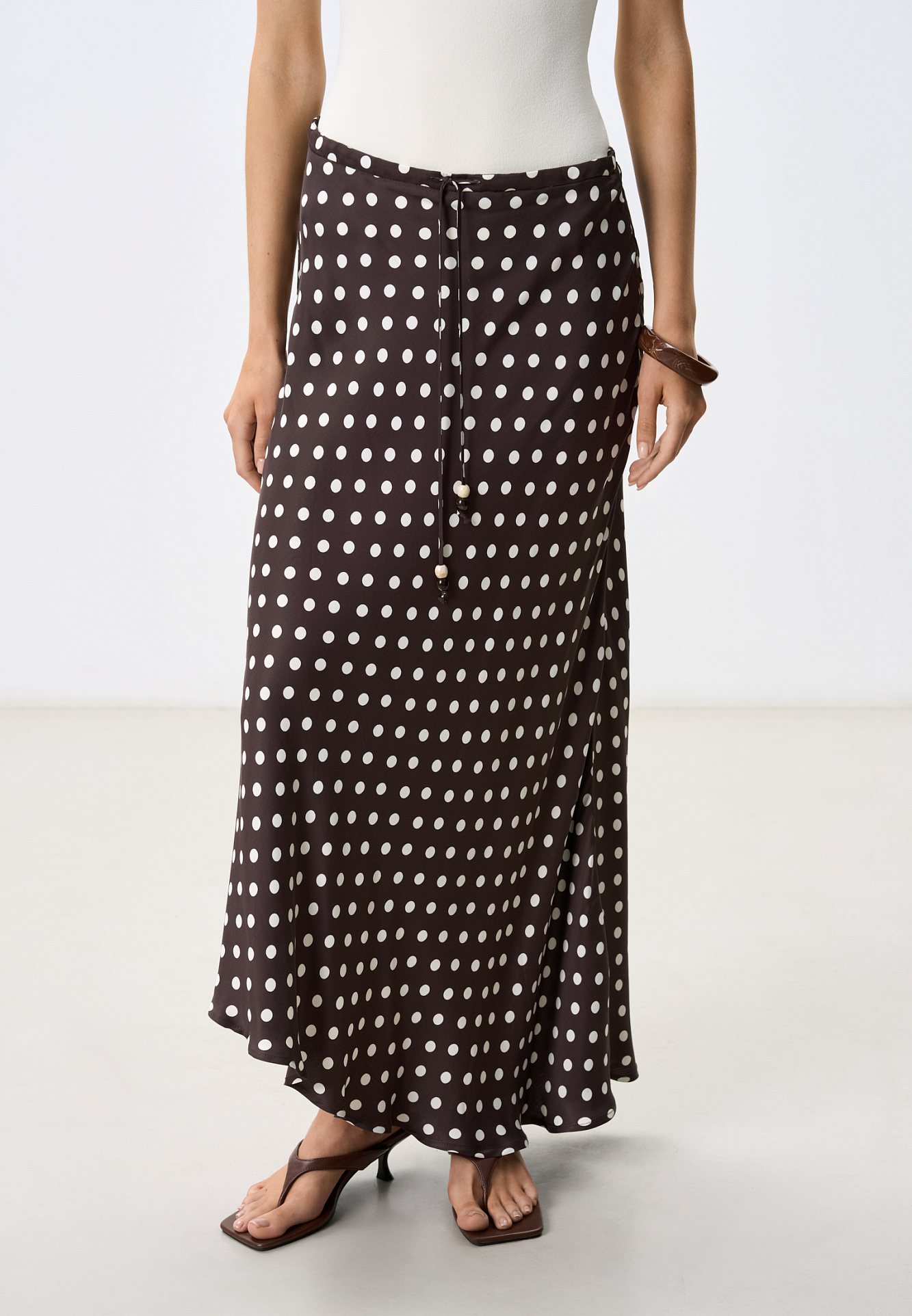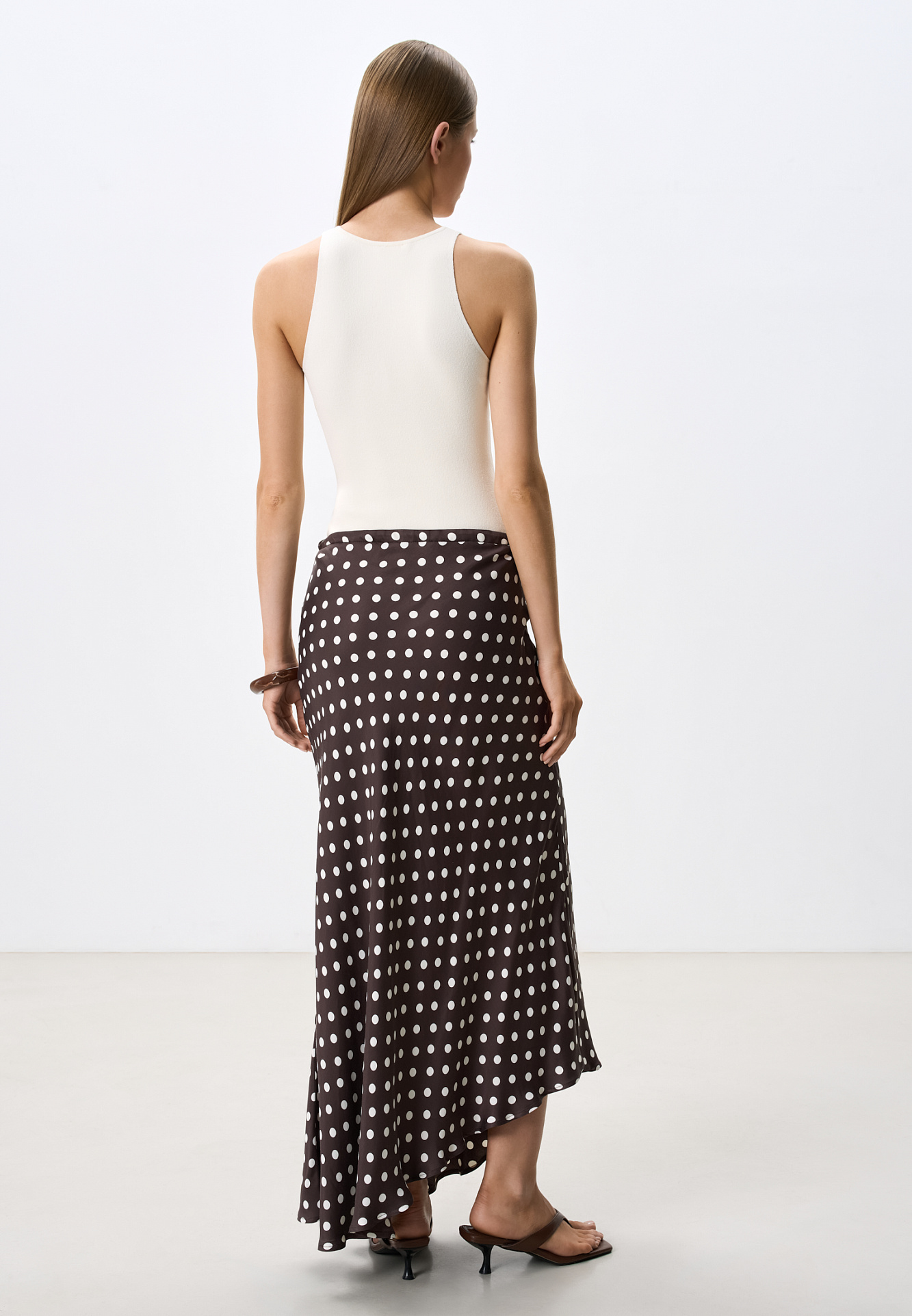 Принтованная юбка длины макси из 100% вискозы. Модель асимметричного кроя, с поясом, декорированным бусинами, и застежкой на потайную молнию сбоку.