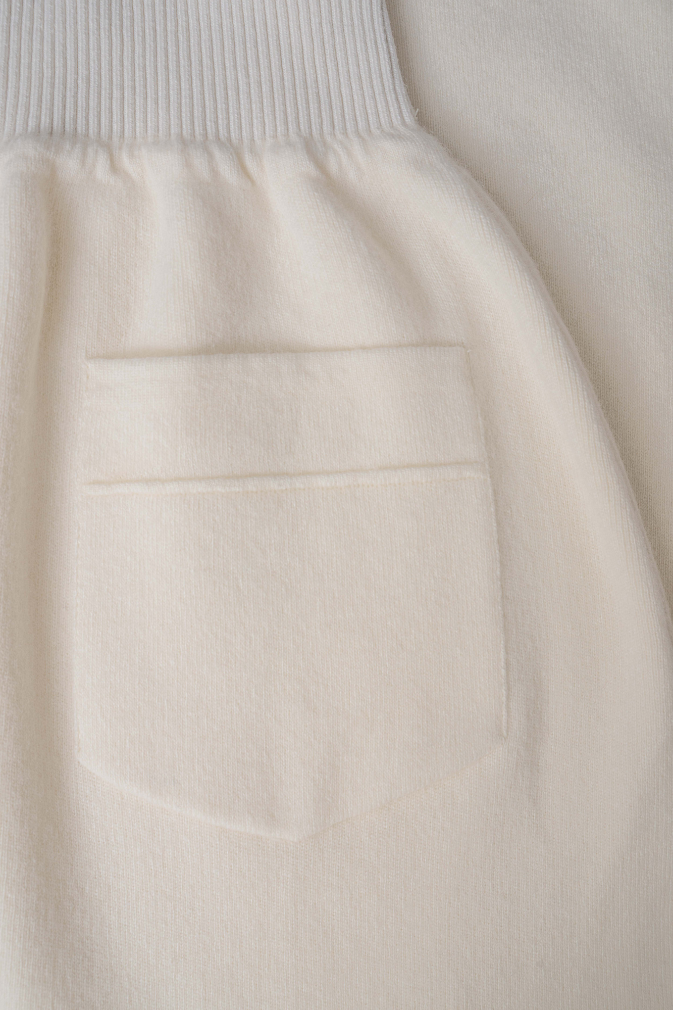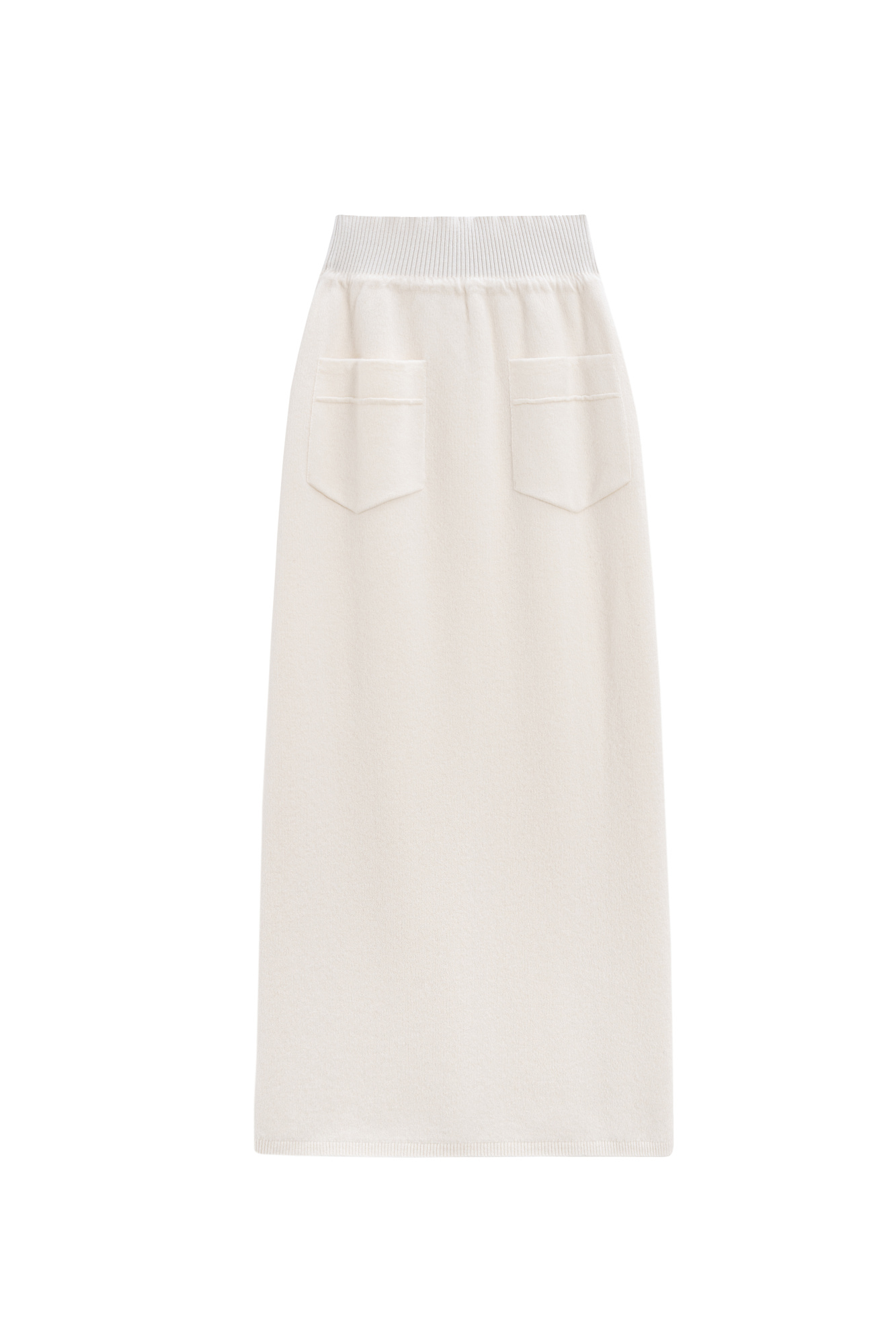 Трикотажная юбка длины макси из кашемира и шерсти. Модель по фигуре, с широким эластичным поясом в рубчик, дополненным кулиской и двумя накладными карманами сзади. Модель декорировано вывязанным логотипом