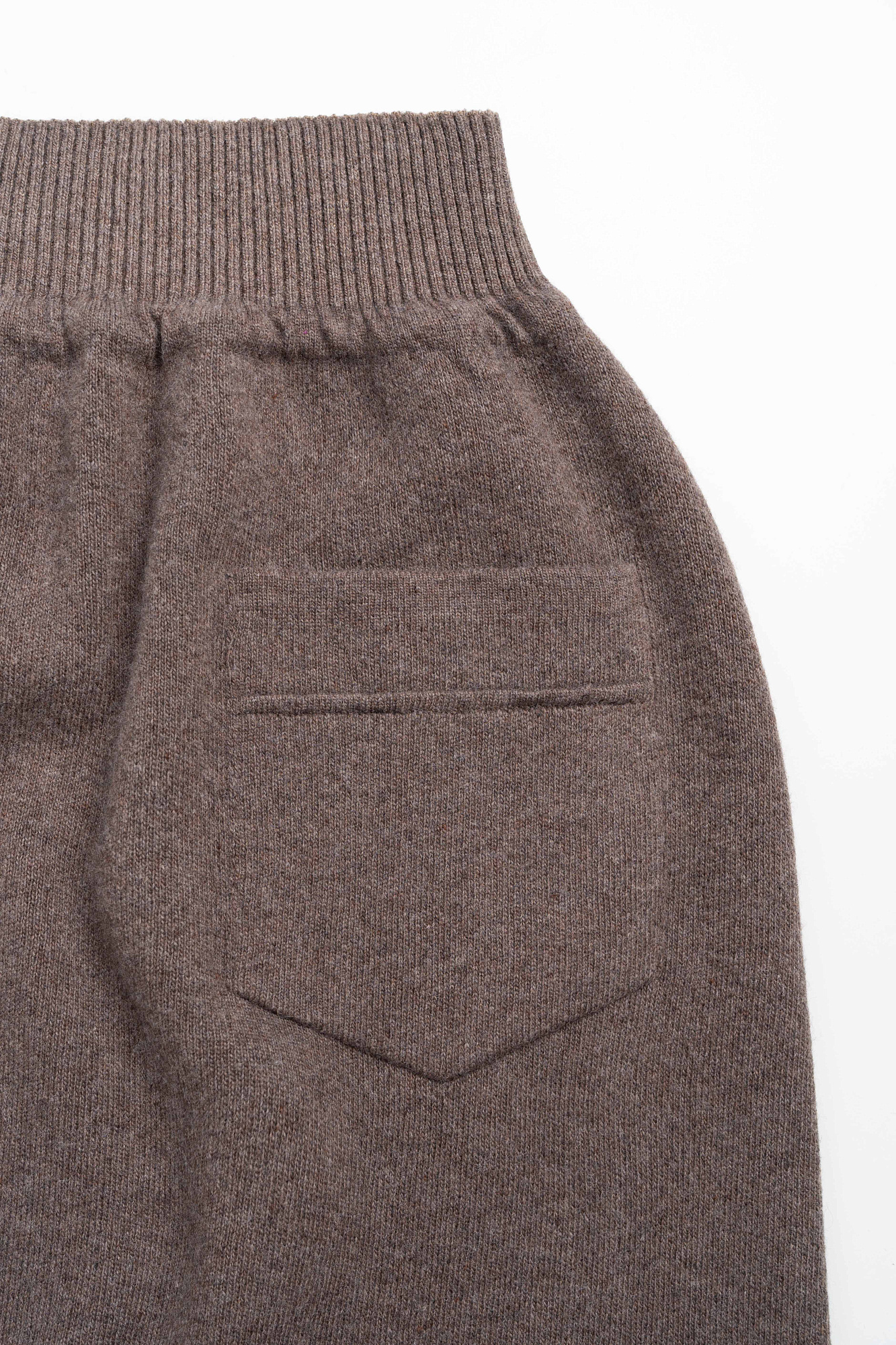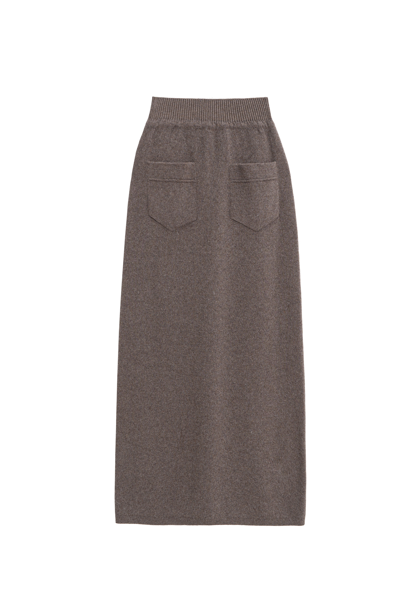 Трикотажная юбка длины макси из кашемира и шерсти. Модель по фигуре, с широким эластичным поясом в рубчик, дополненным кулиской и двумя накладными карманами сзади. Модель декорировано вывязанным логотипом