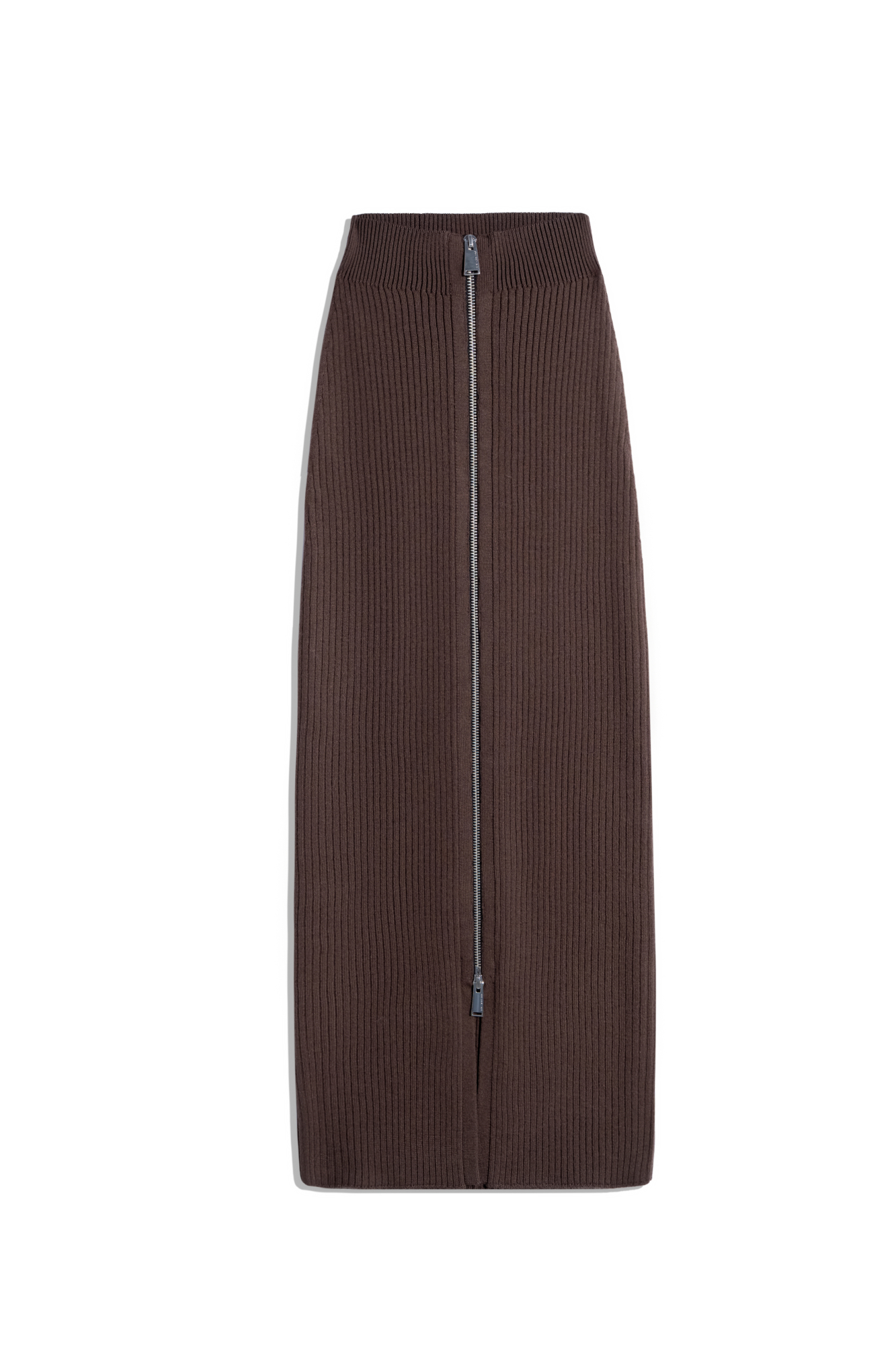 Трикотажная юбка длины макси с разрезом спереди. Модель по фигуре с широким эластичным поясом. Изделие декорировано молнией с крупной фурнитурой.