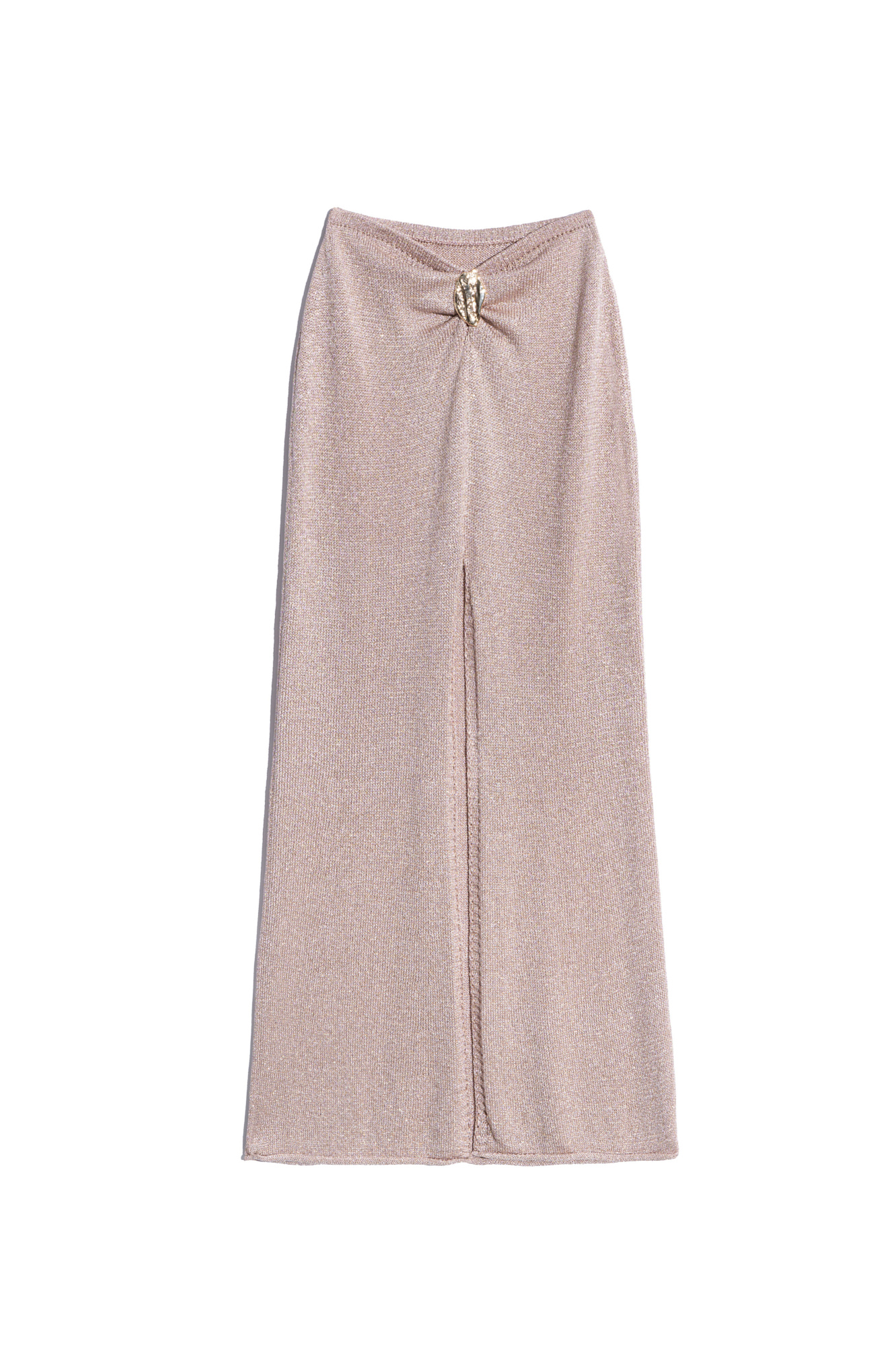 Трикотажная юбка длины макси из вискозы с люрексом. Модель с высоким разрезом спереди, валиком на подоле и акцентным элементом на поясе.