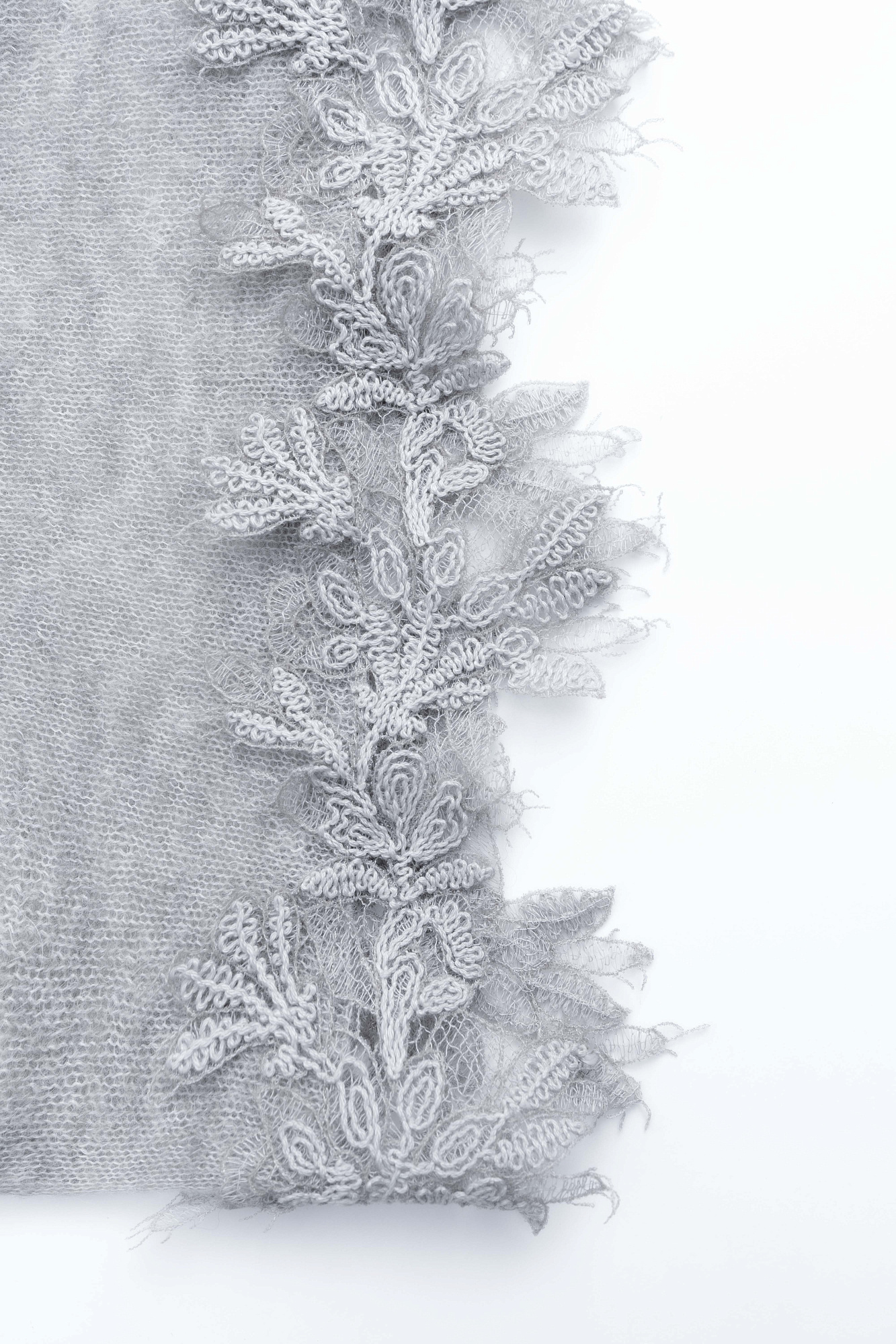Трикотажная юбка из шерсти мериноса экстрафайн и альпака экстрафайн. Модель А-силуэта с широким поясом на резинке. Подол изделия декорирован кружевом.