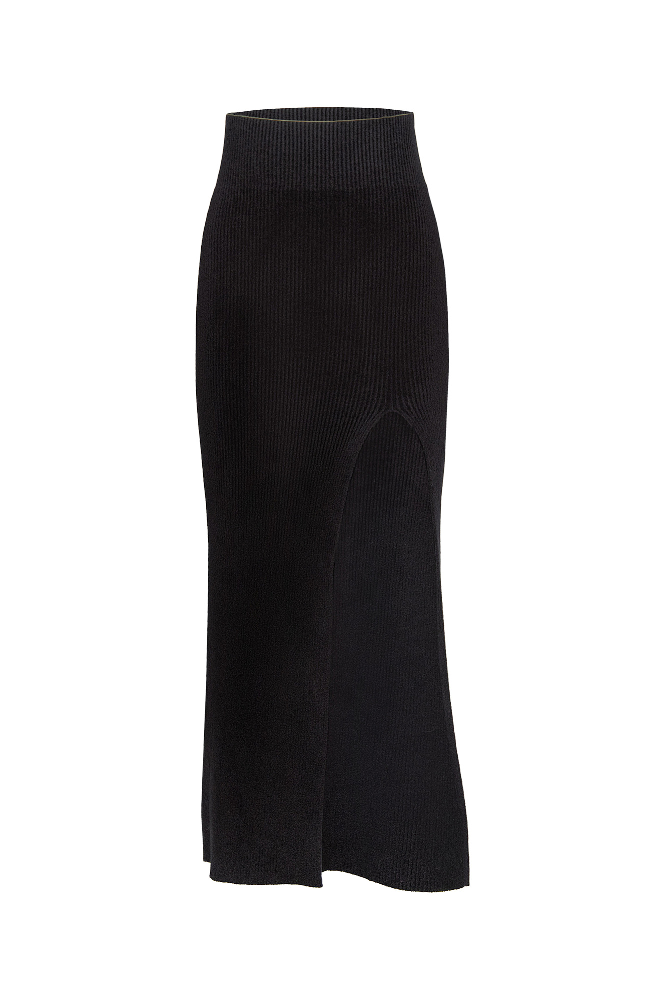 Трикотажная юбка длины миди из вискозы в рубчик. Модель приталенного силуэта с широким эластичным поясом и высоким разрезом спереди.