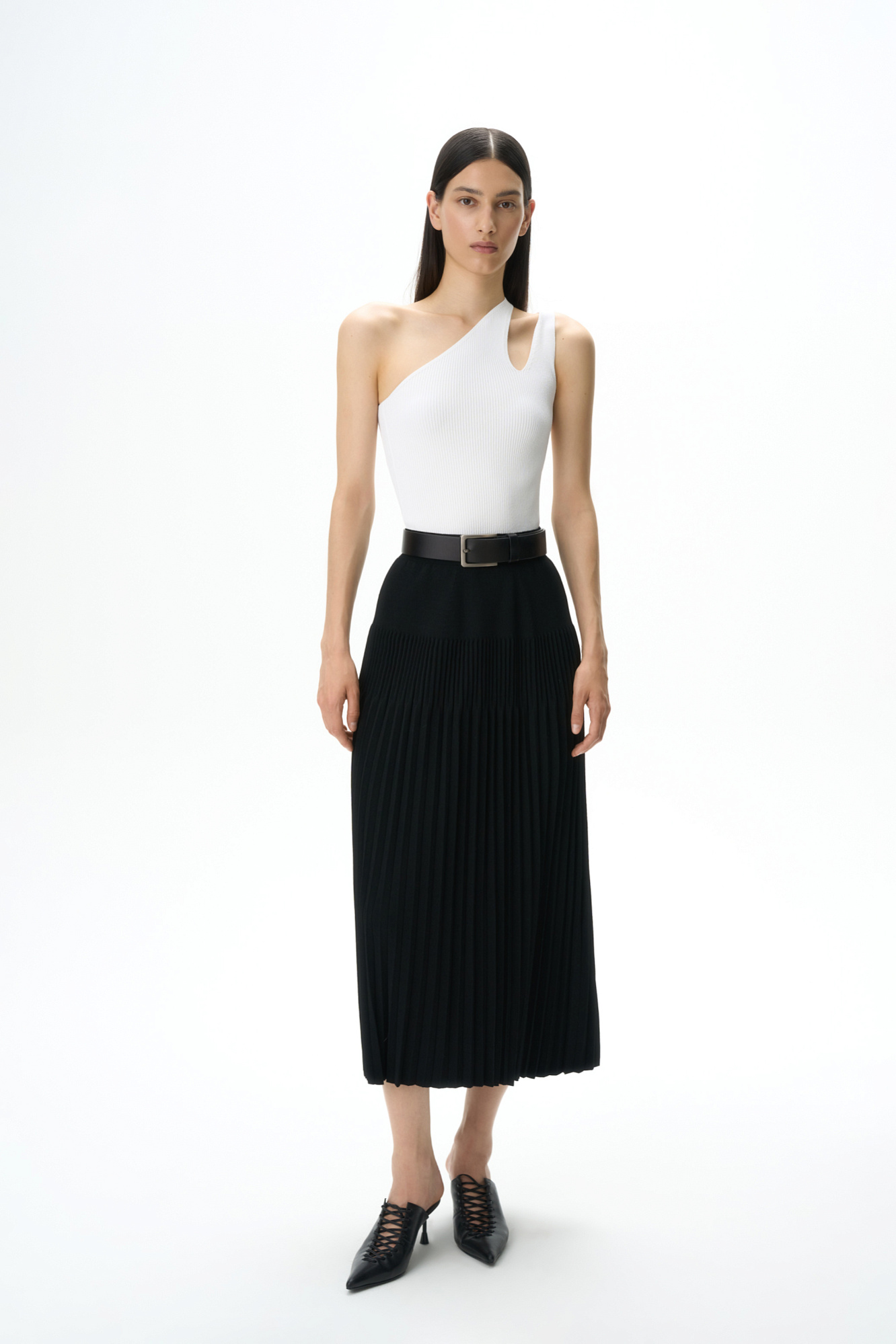 Плиссированая юбка длины миди. Модель приталенного силуэта с эластичным поясом в рубчик.