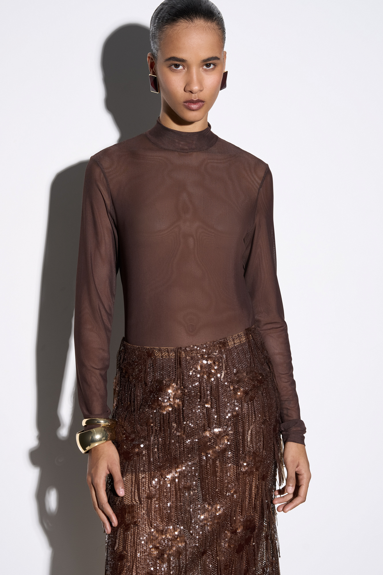 Юбка длины миди с геометрическим орнаментом, вышитым прозрачными пайетками. Модель декорирована россыпью пайеток и бахромой на подоле. Изделие выполнено без подкладки.