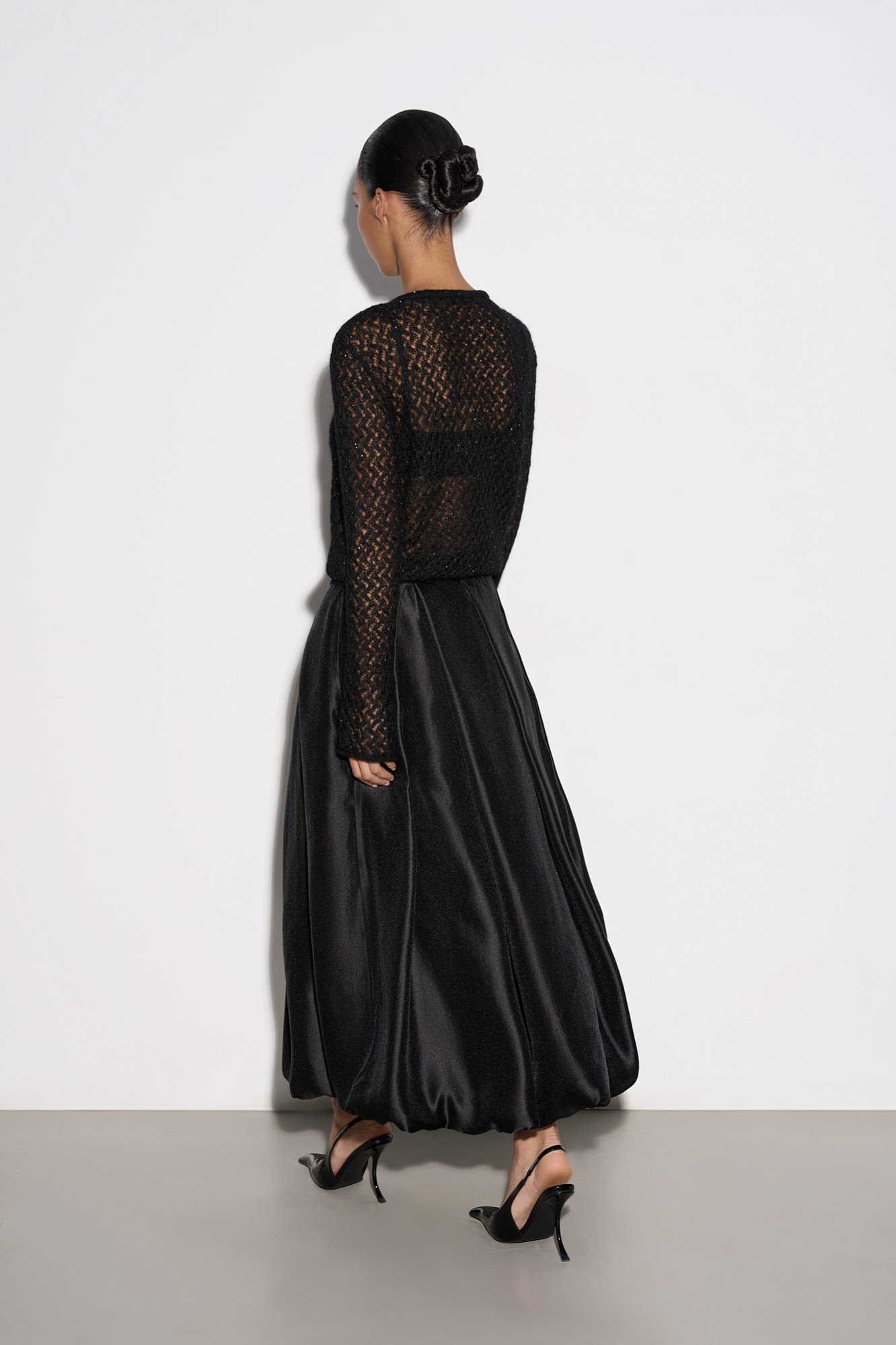Юбка-баллон длины миди из атласной ткани. Модель выполнена в крупную складку. Застежка на потайную молнию.