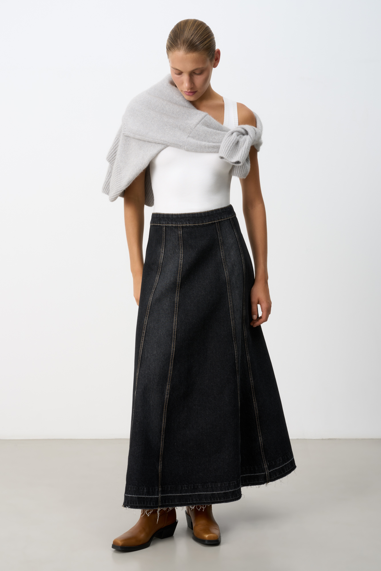 Юбка миди расклешенного кроя из денима. Рельефные швы. Застежка на молнию сзади.