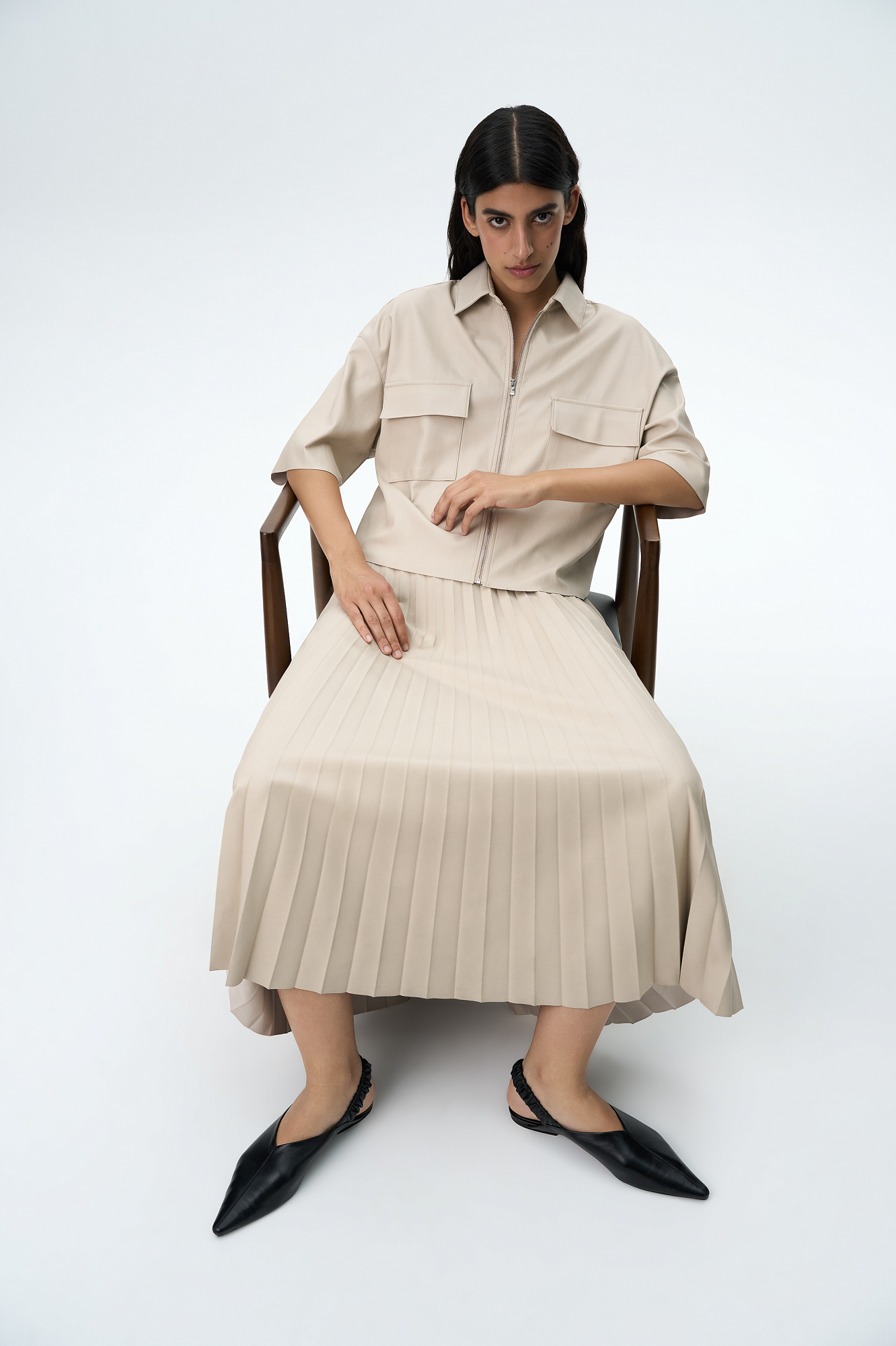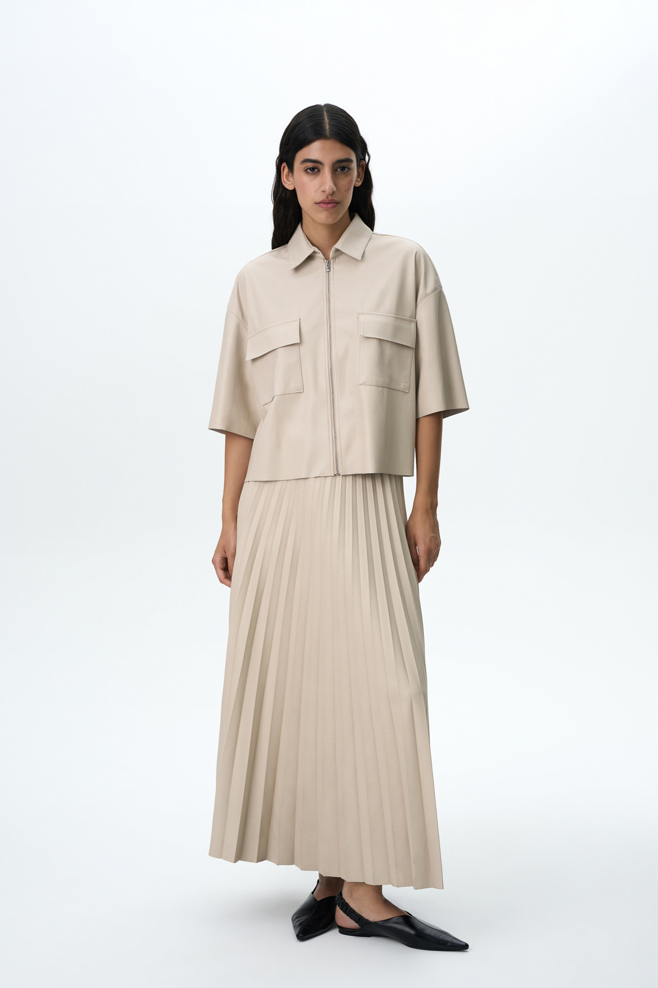Плиссированная юбка миди из экокожи с эластичным поясом и застежкой на молнии.