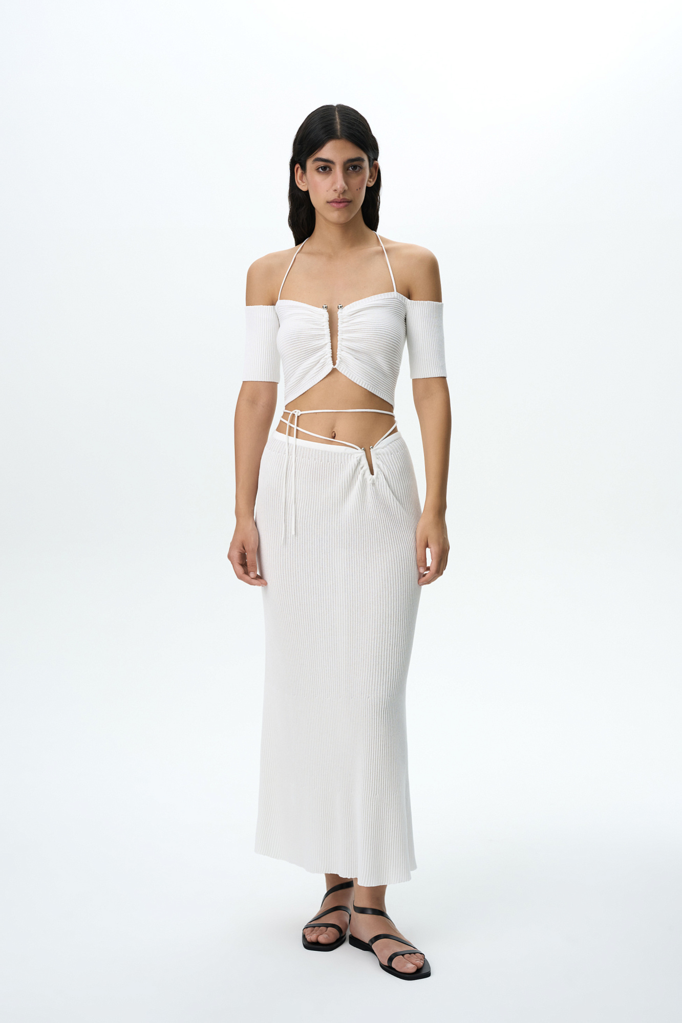 Трикотажная юбка макси с металлической перемычкой и шнуровкой на талии. Дополнить образ можно топом.