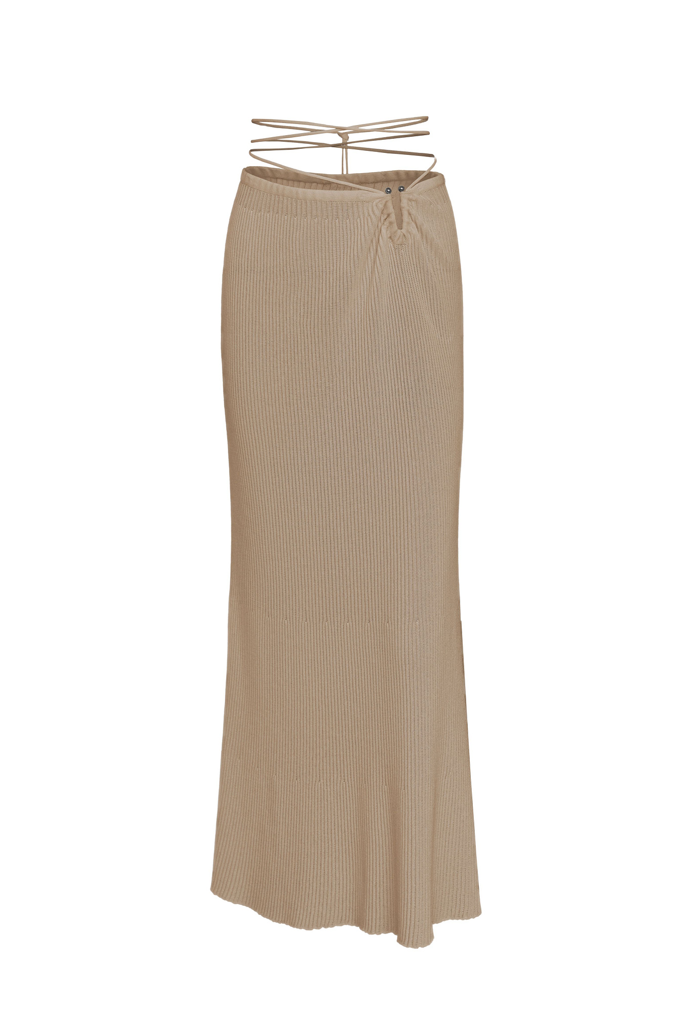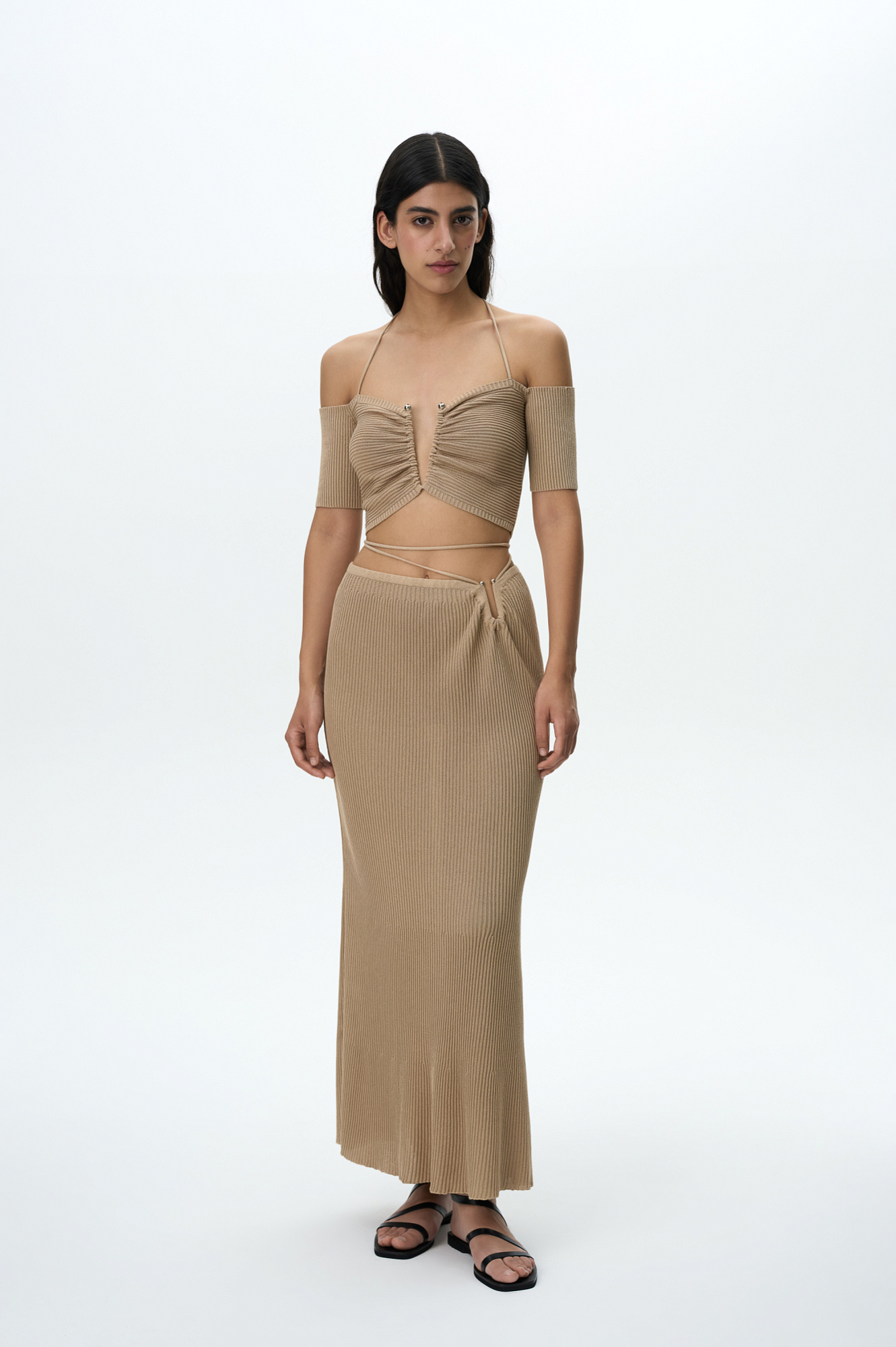 Трикотажная юбка макси с металлической перемычкой и шнуровкой на талии. Дополнить образ можно топом.