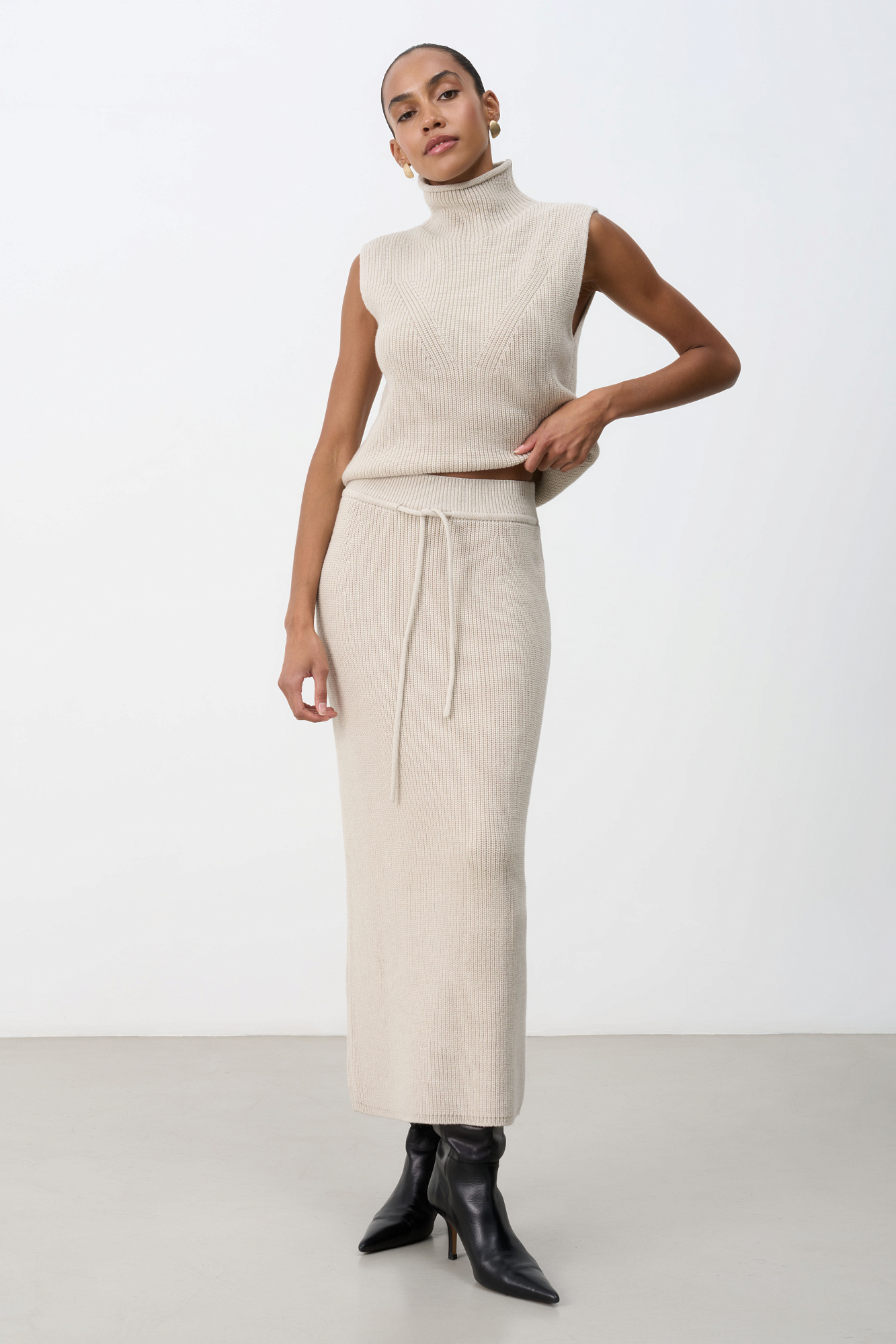 Трикотажная юбка длины миди. Модель прямого силуэта с эластичным поясом на кулиске. Дополнить образ можно жилетом в таком же стиле.