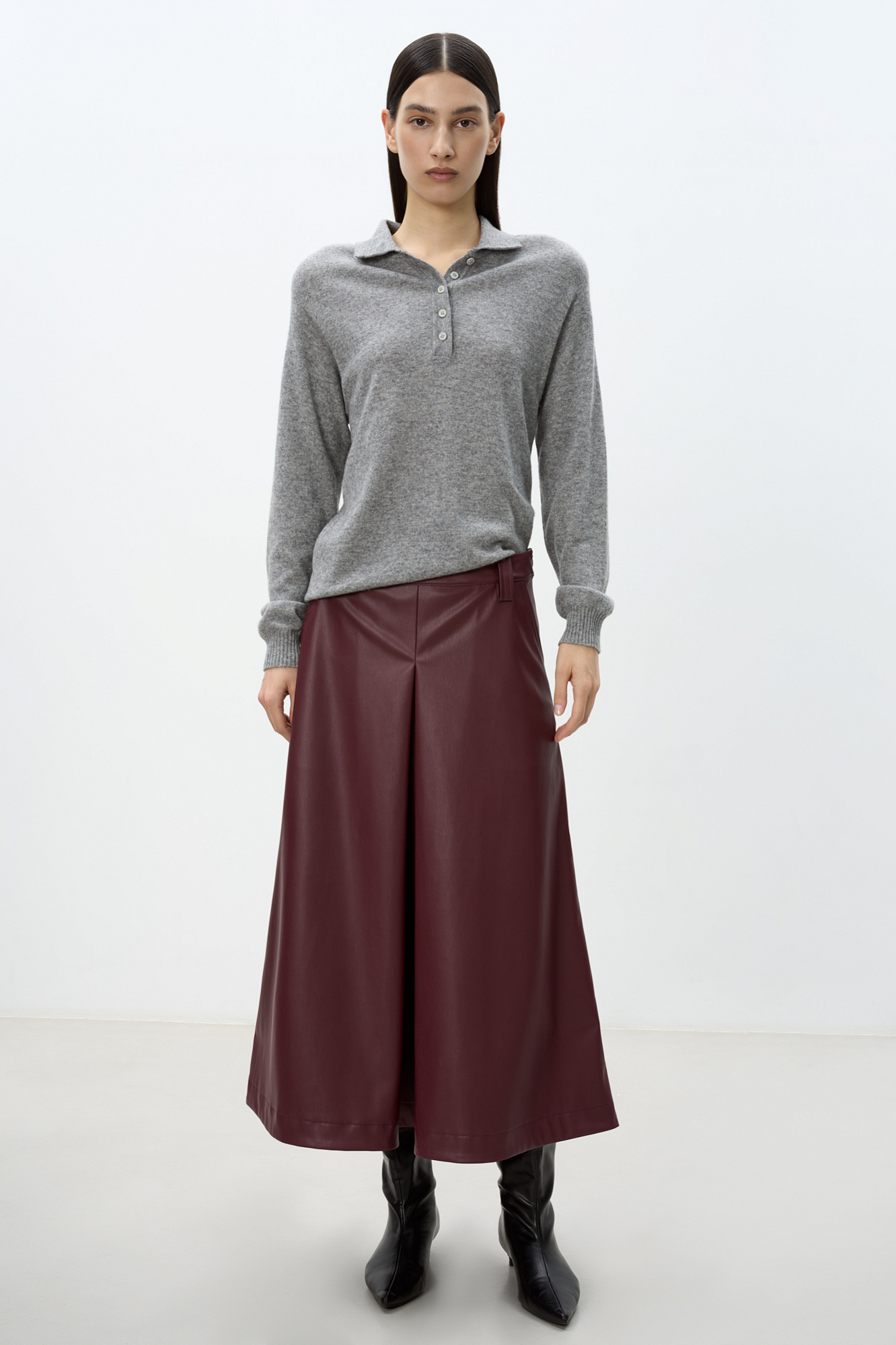 Юбка из экокожи длины миди со встречными складками, карманами и шлевками на поясе для ремня. Застежка на боковую молнию. Изделие без подкладки.