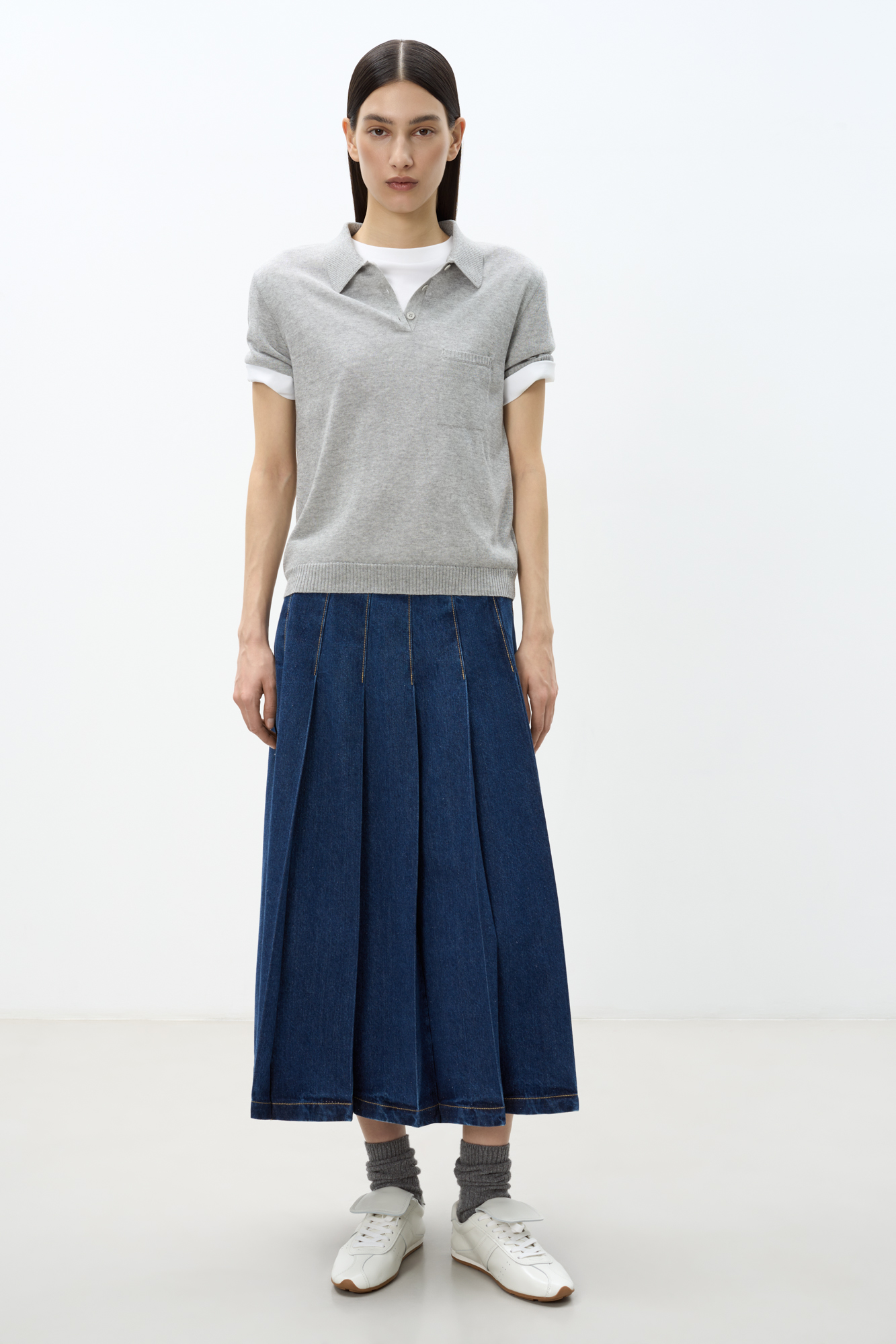 Джинсовая юбка плиссе из 100% хлопка. Модель расклешенного силуэта с боковой застежкой на молнию и пуговицу. Шлевки на поясе для ремня.