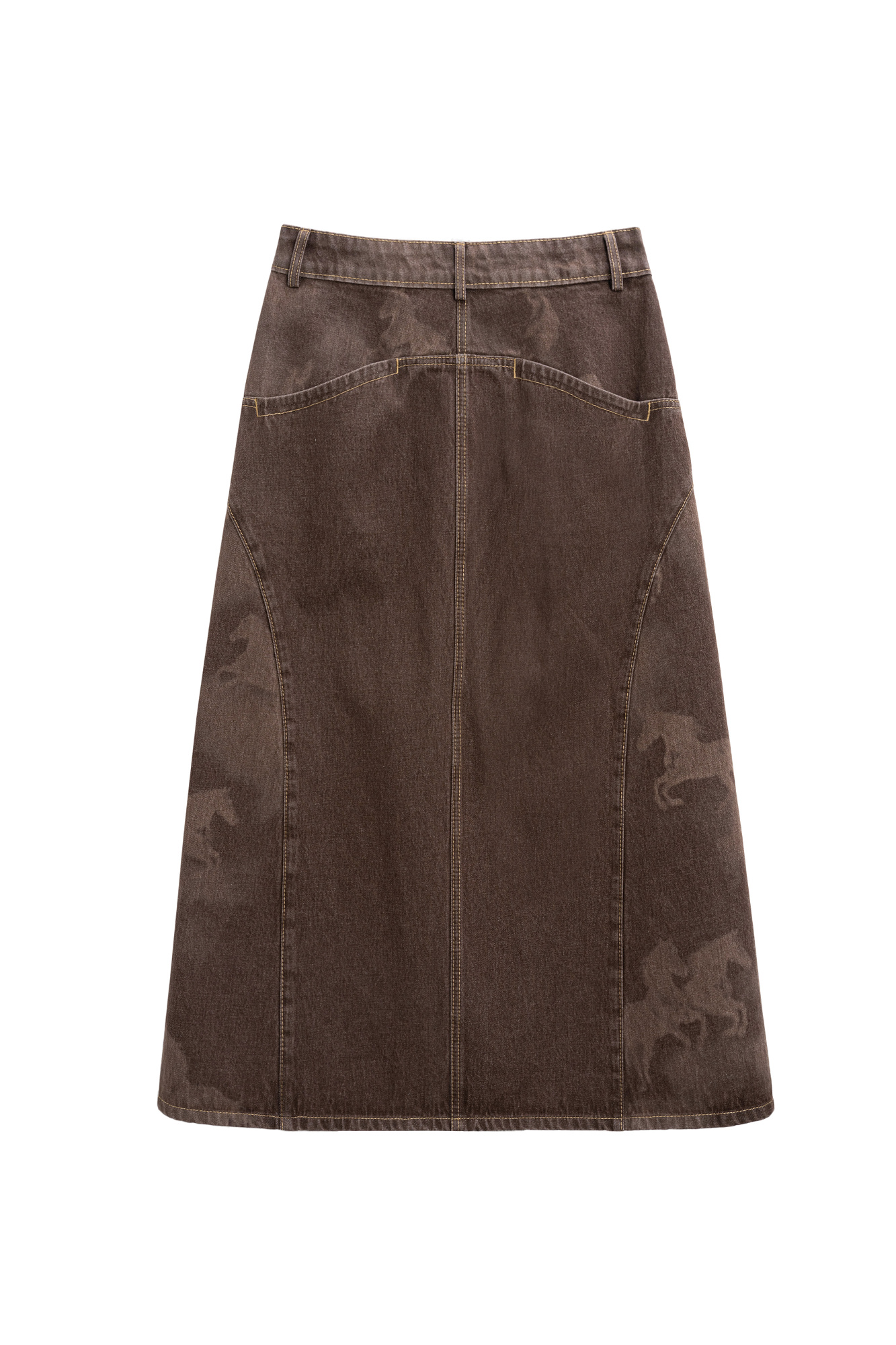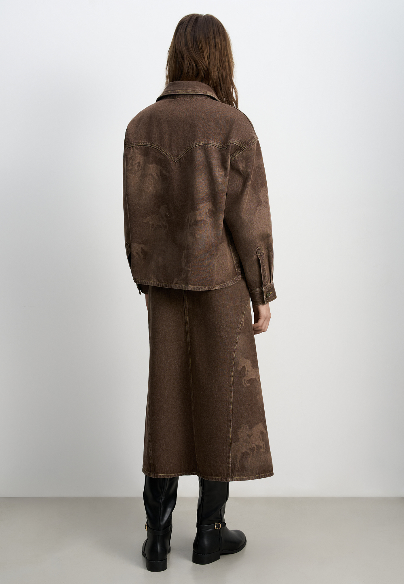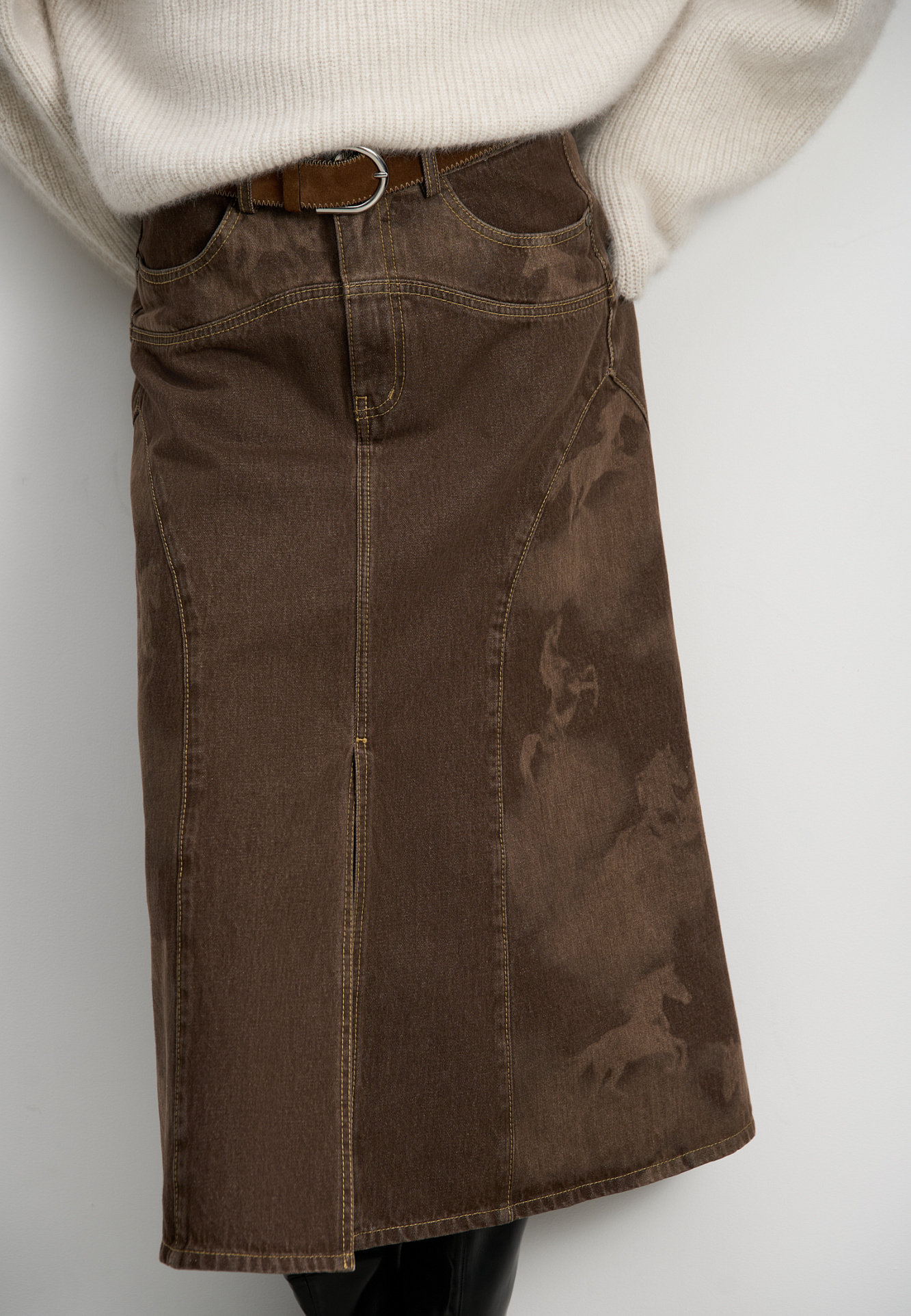 Джинсовая юбка длины миди из 100% хлопка с принтом лошадей. Модель с разрезом спереди, геометрическими вытачками, боковыми и задними карманами, шлевками на поясе для ремня и застежкой на металлические пуговицы с логотипом бренда. Изделие декорировано принтом лошадей и подковы, выполненным лазером, и объемными геометрическими вытачками.