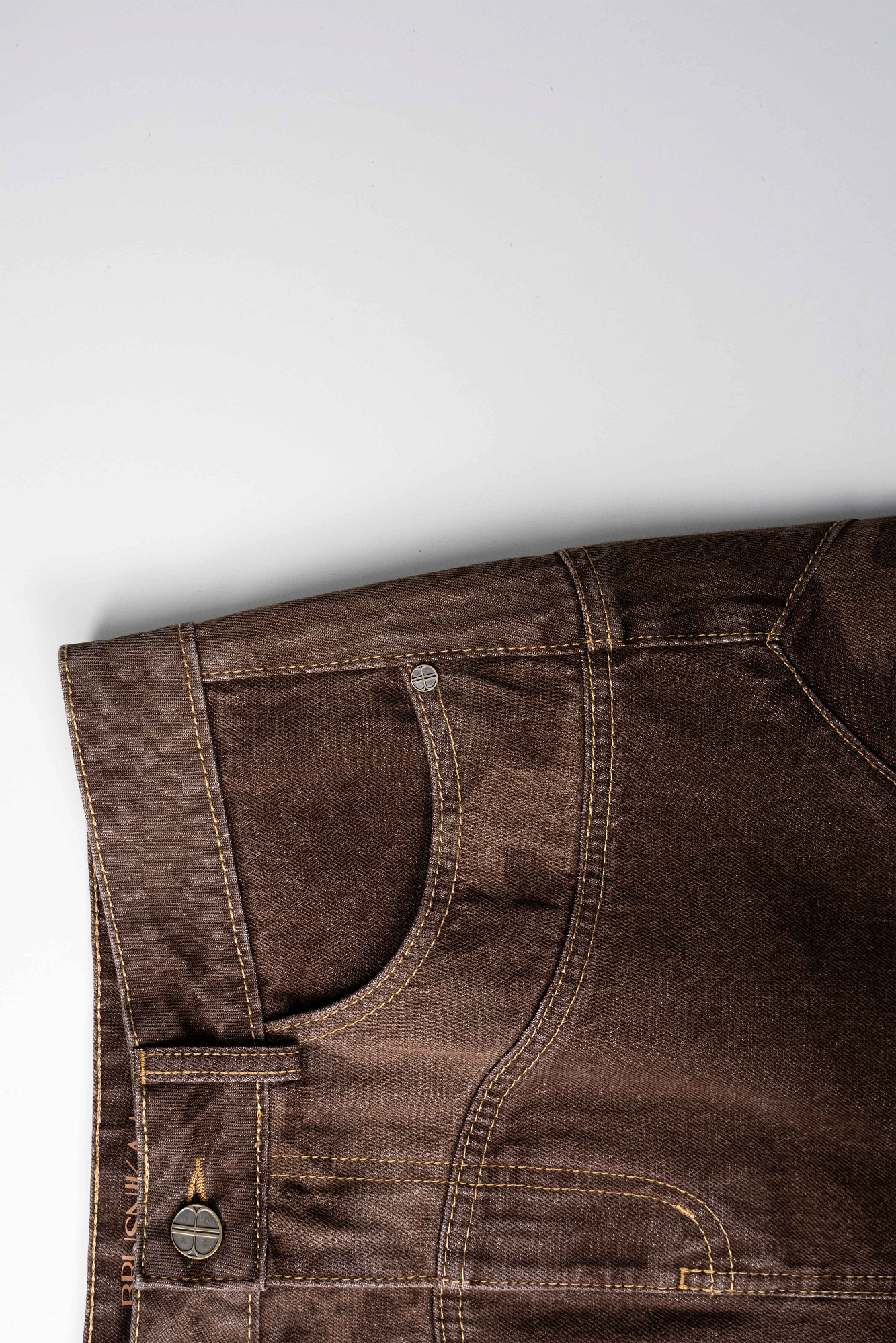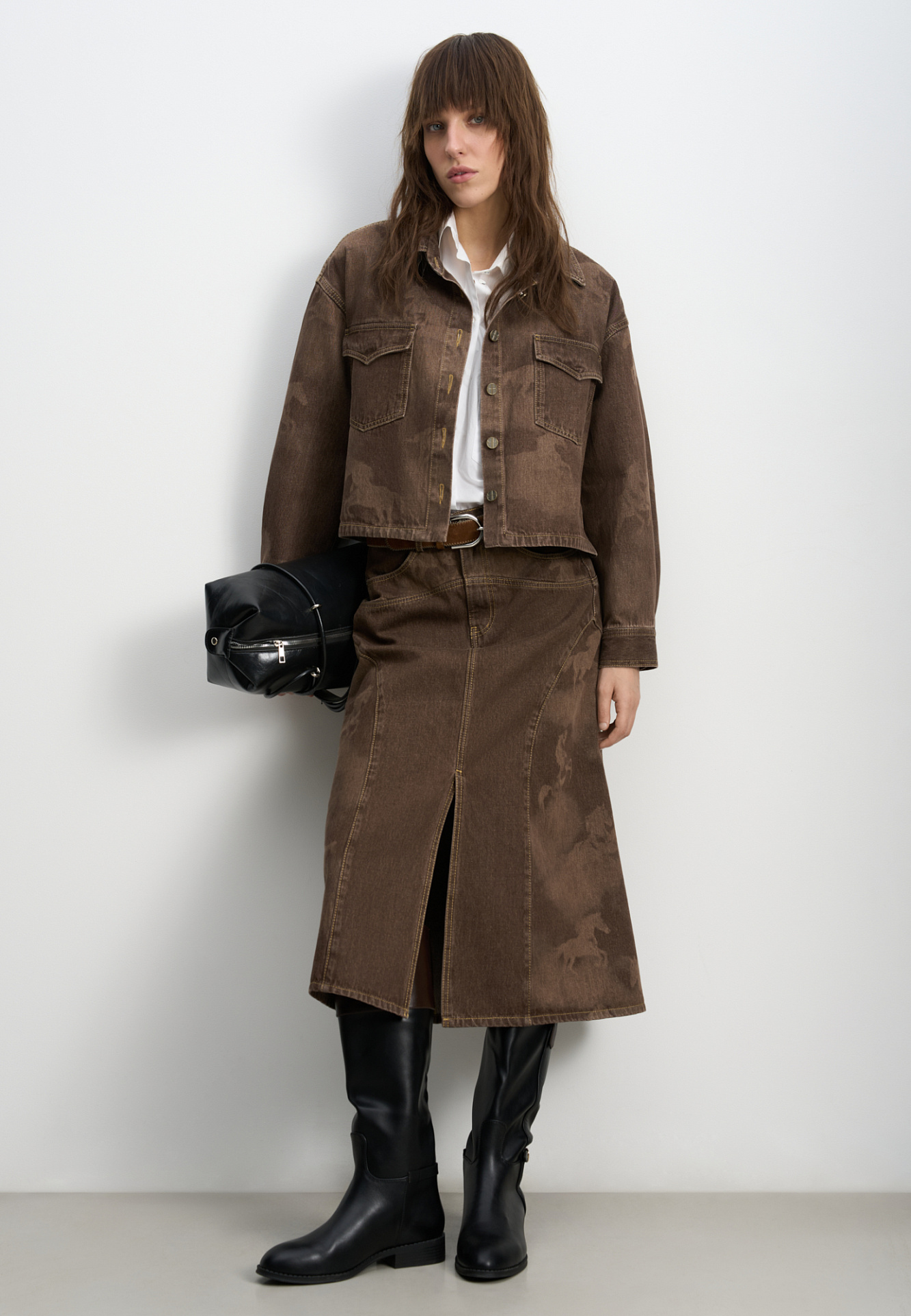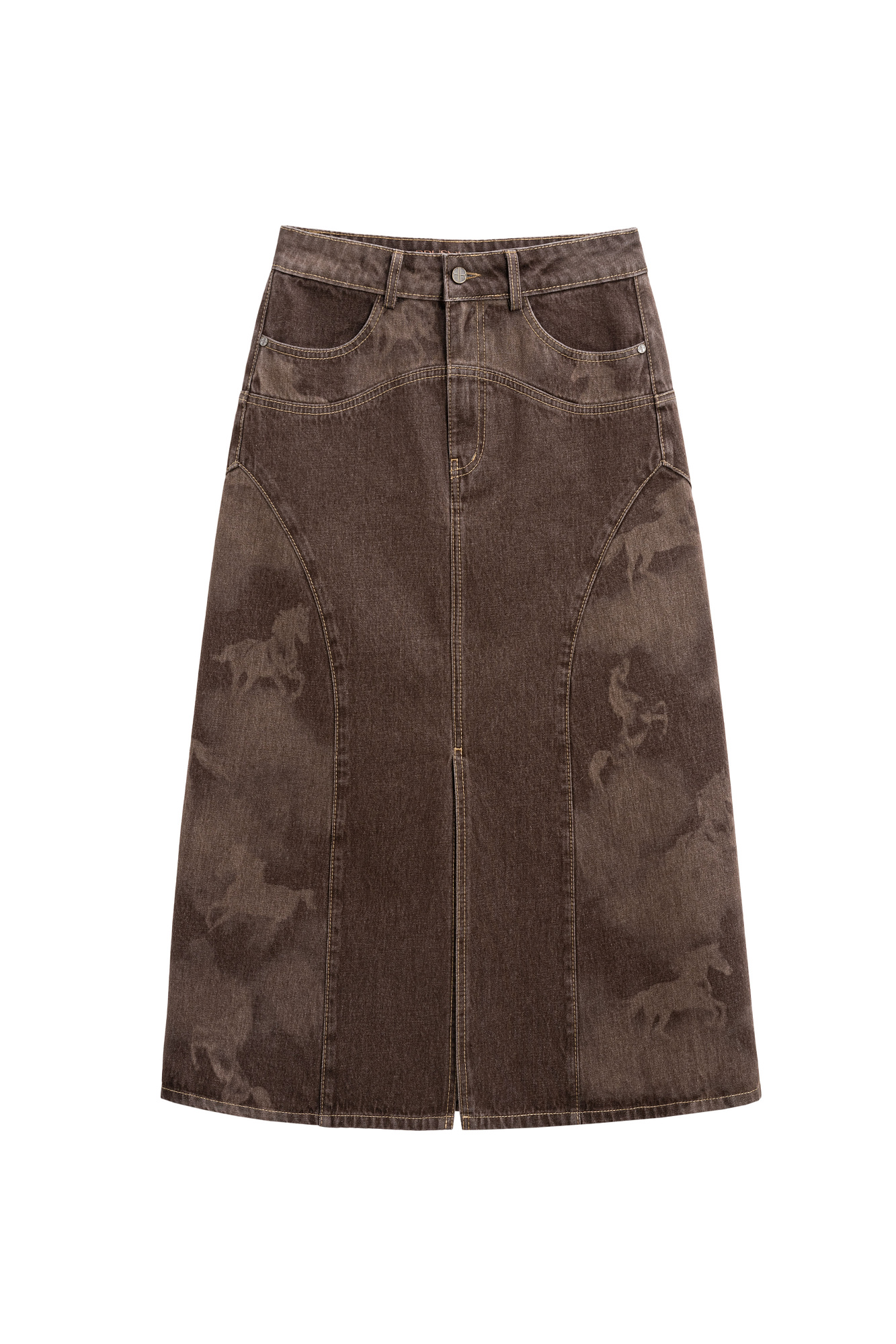 Джинсовая юбка длины миди из 100% хлопка с принтом лошадей. Модель с разрезом спереди, геометрическими вытачками, боковыми и задними карманами, шлевками на поясе для ремня и застежкой на металлические пуговицы с логотипом бренда. Изделие декорировано принтом лошадей и подковы, выполненным лазером, и объемными геометрическими вытачками.