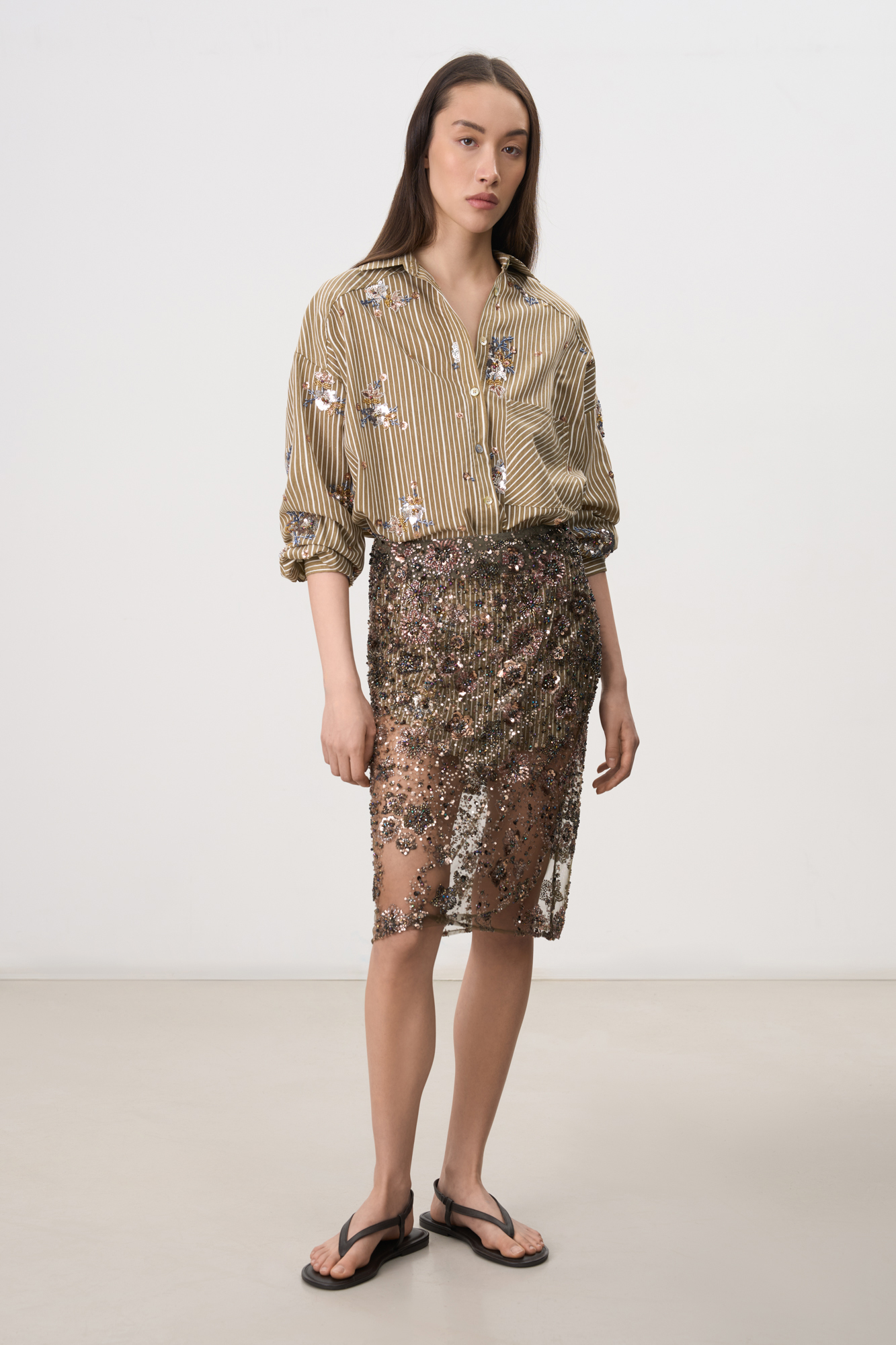 Юбка длины миди с цветочным орнаментом, вышитым пайетками и бисером. Изделие без подкладки.