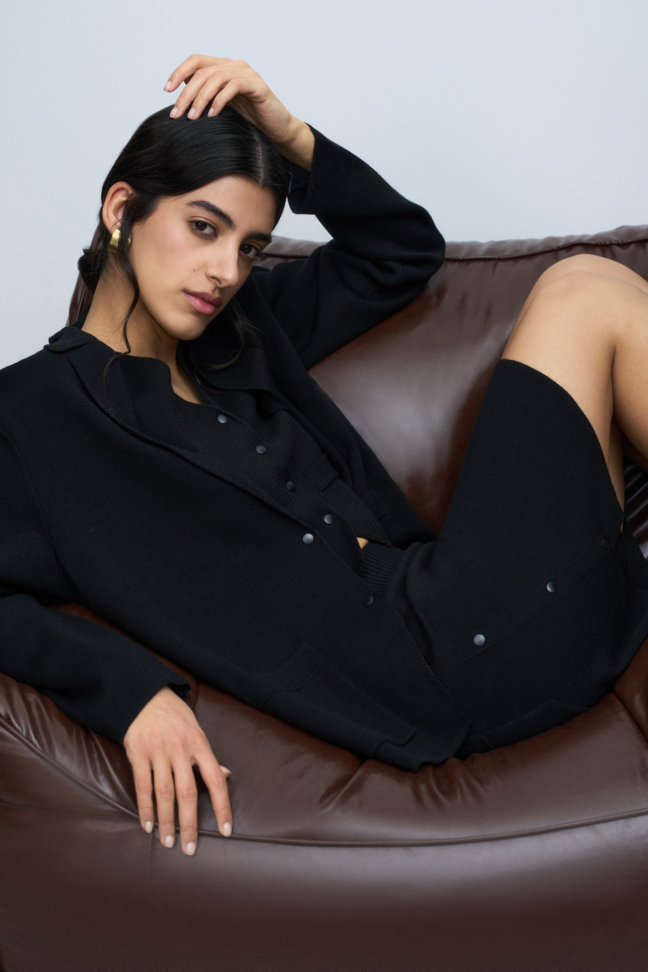 Трикотажная юбка длины мини из шерсти мериноса. Модель с боковой планкой на кнопках, небольшим вырезом сбоку, накладными карманами сзади и широким эластичным поясом на резинке. Дополнить образ можно жилетом, жакетом или бомбером.