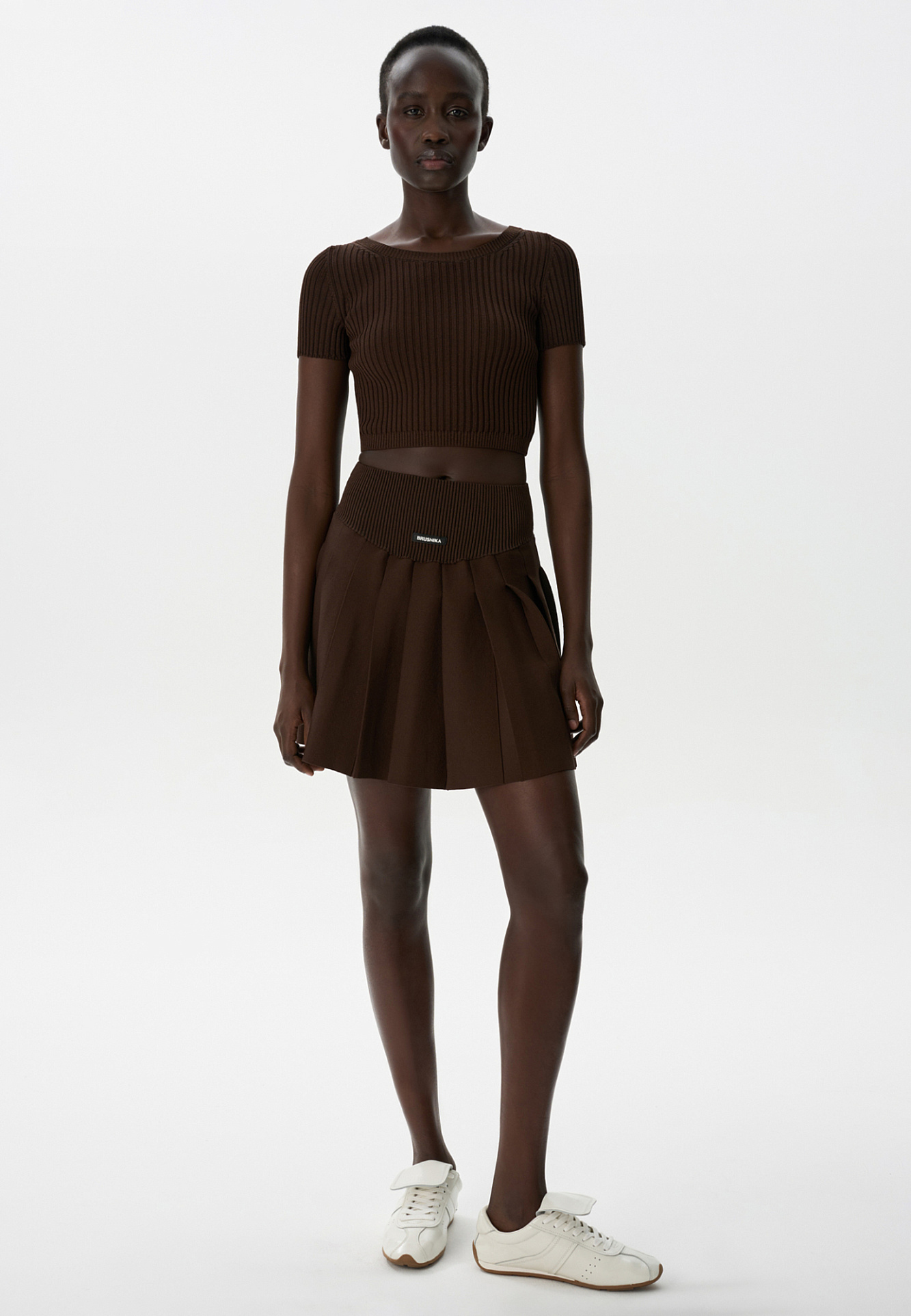 Трикотажная юбка длины мини в теннисном стиле. Модель с широким эластичным поясом в рубчик. Изделие декорировано брендированным ярлыком.