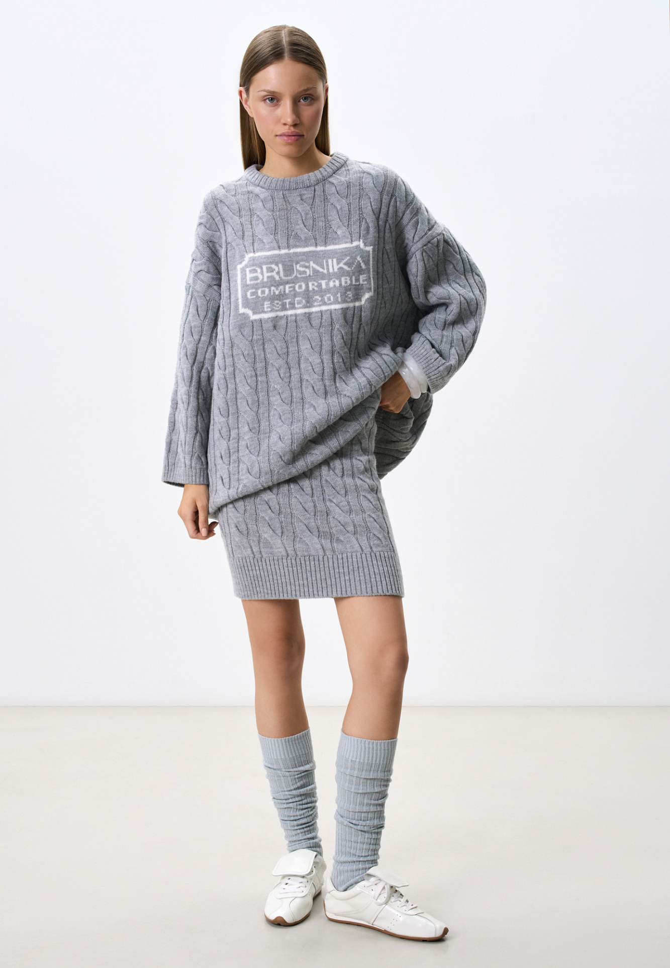 Трикотажная юбка длины мини с объемными косами из мягкой шерсти. Широкий эластичный пояс на кулиске. Дополнить образ можно джемпером в том же стиле.