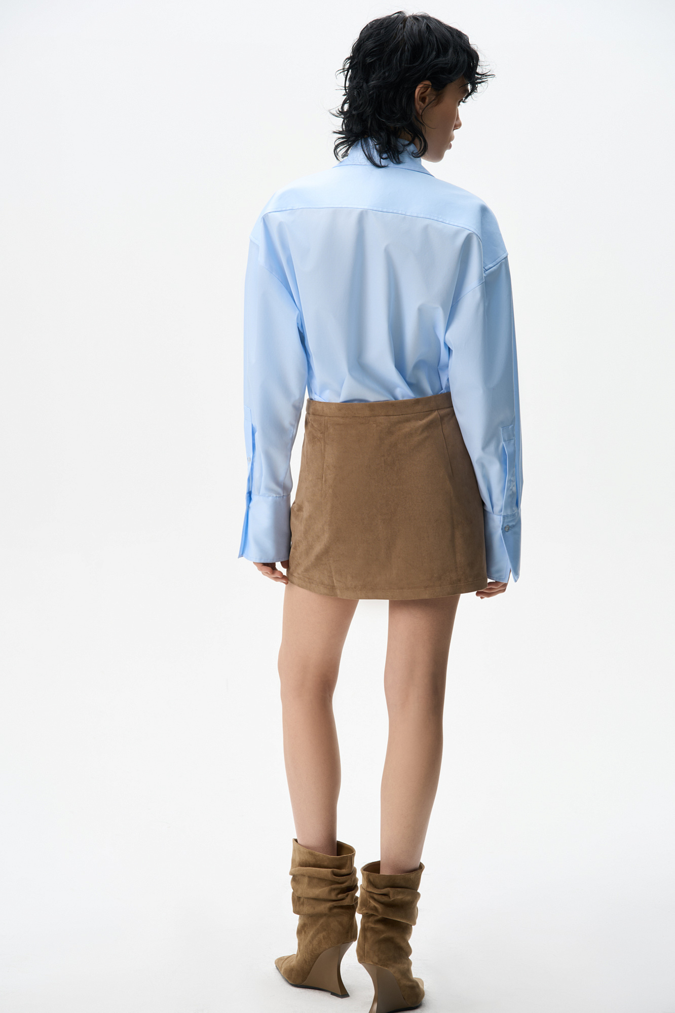 Юбка длины мини из ткани с имитацией внешнего вида и свойств натуральной замши. Застежка на скрытую пуговицу и молнию спереди.