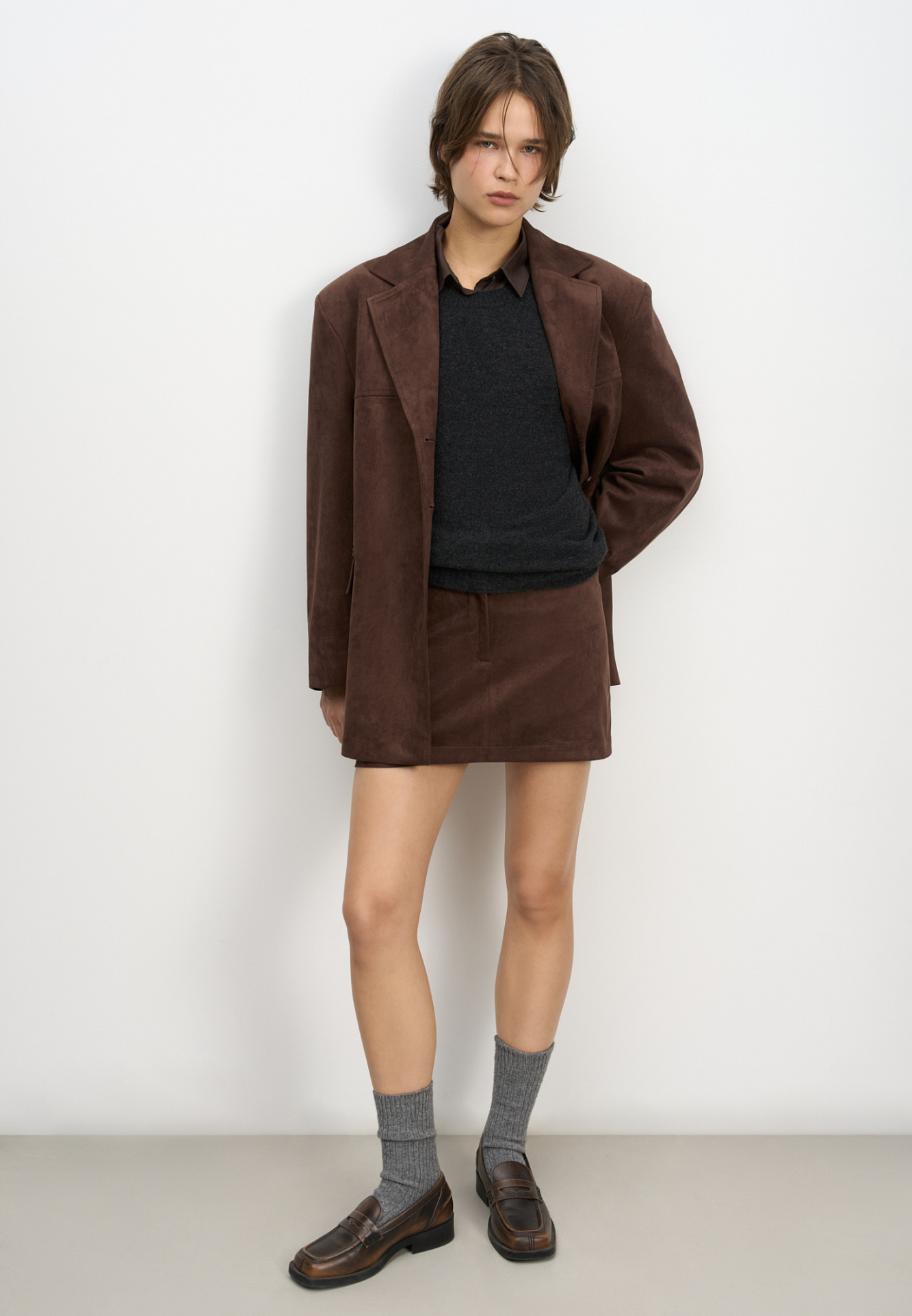 Юбка длины мини из ткани с имитацией внешнего вида и свойств натуральной замши. Застежка на скрытую пуговицу и молнию спереди.
