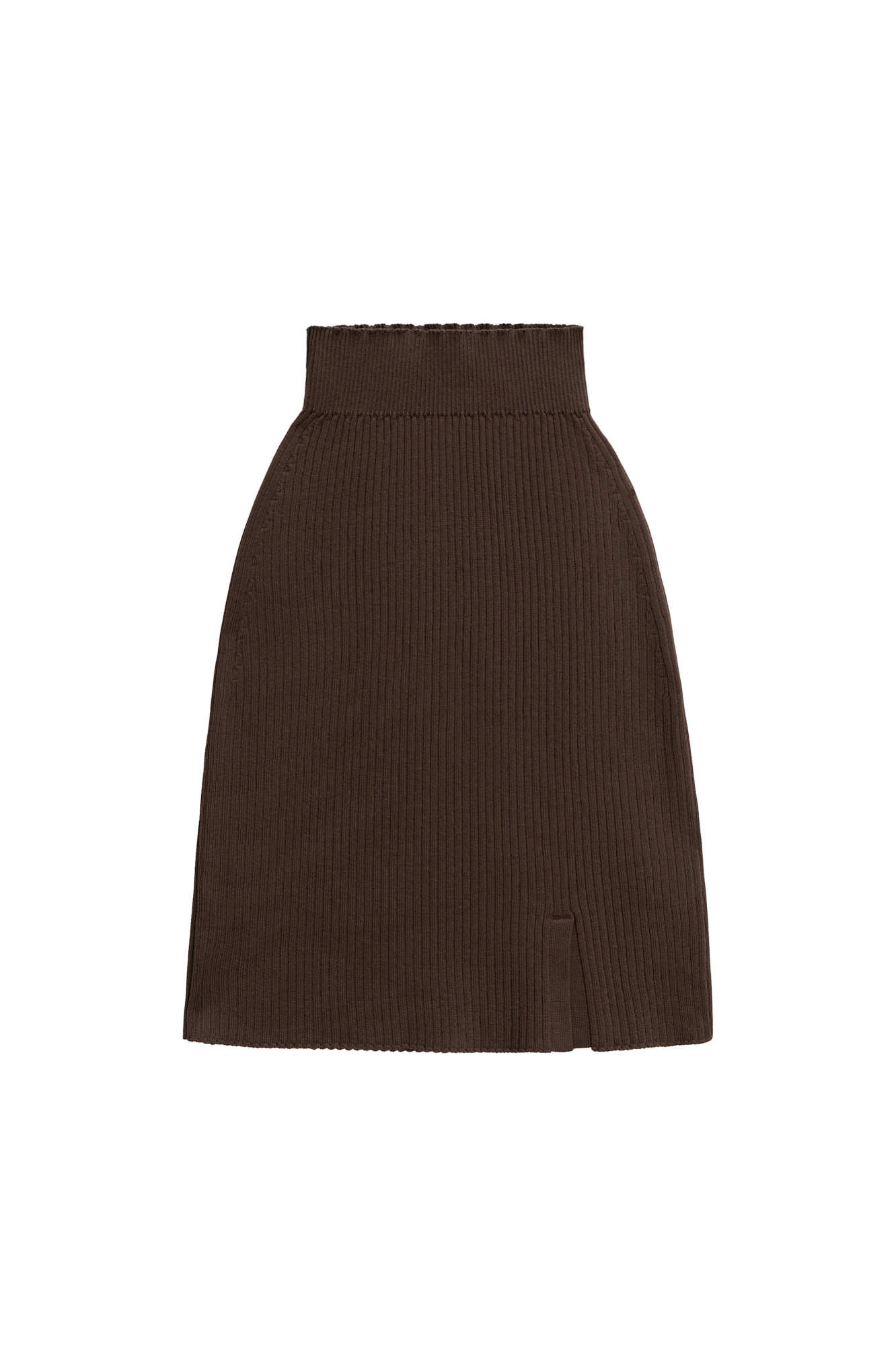 Трикотажная юбка длины мини из вискозы. Модель приталенного силуэта с эластичным поясом и небольшим разрезом сбоку.