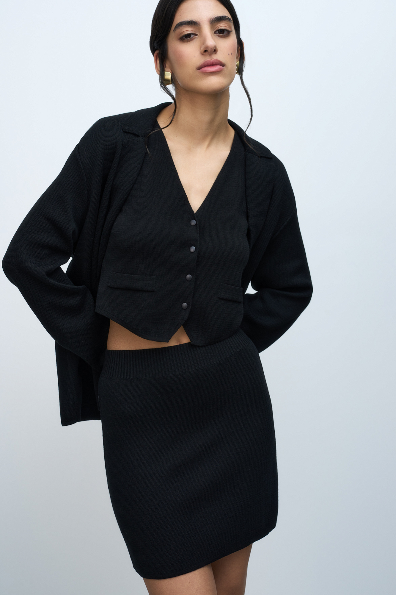 Трикотажная юбка длины мини из шерсти мериноса. Модель с боковой планкой на кнопках, небольшим вырезом сбоку, накладными карманами сзади и широким эластичным поясом на резинке. Дополнить образ можно жилетом, жакетом или бомбером.