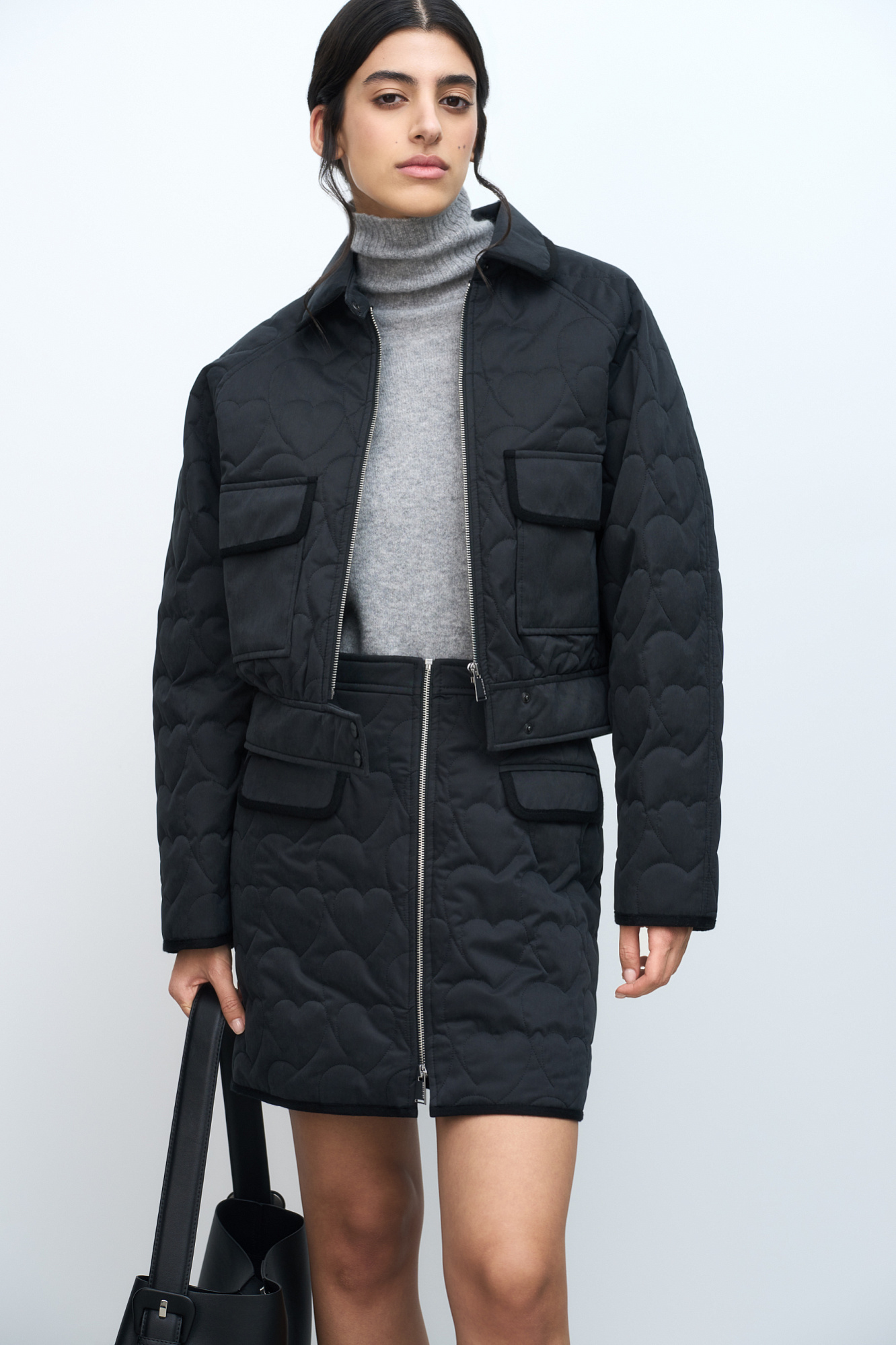 Стеганая юбка длины мини. Модель приталенного силуэта с карманами спереди. Стежка выполнена в виде сердец.