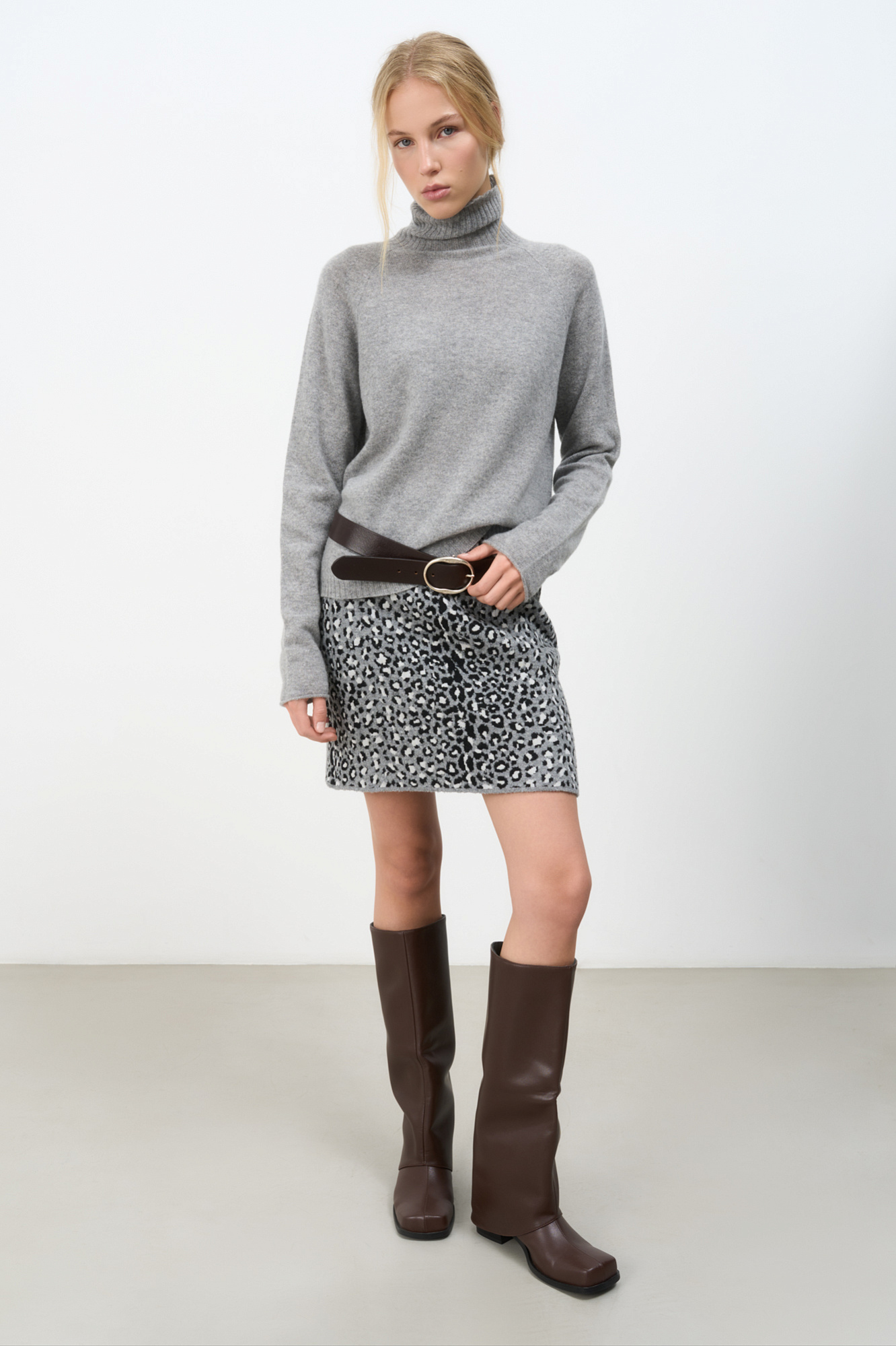 Юбка длины мини с жаккардовым анималистическим дизайном. Пояс на резинке. Дополнить образ можно жакетом в таком же стиле