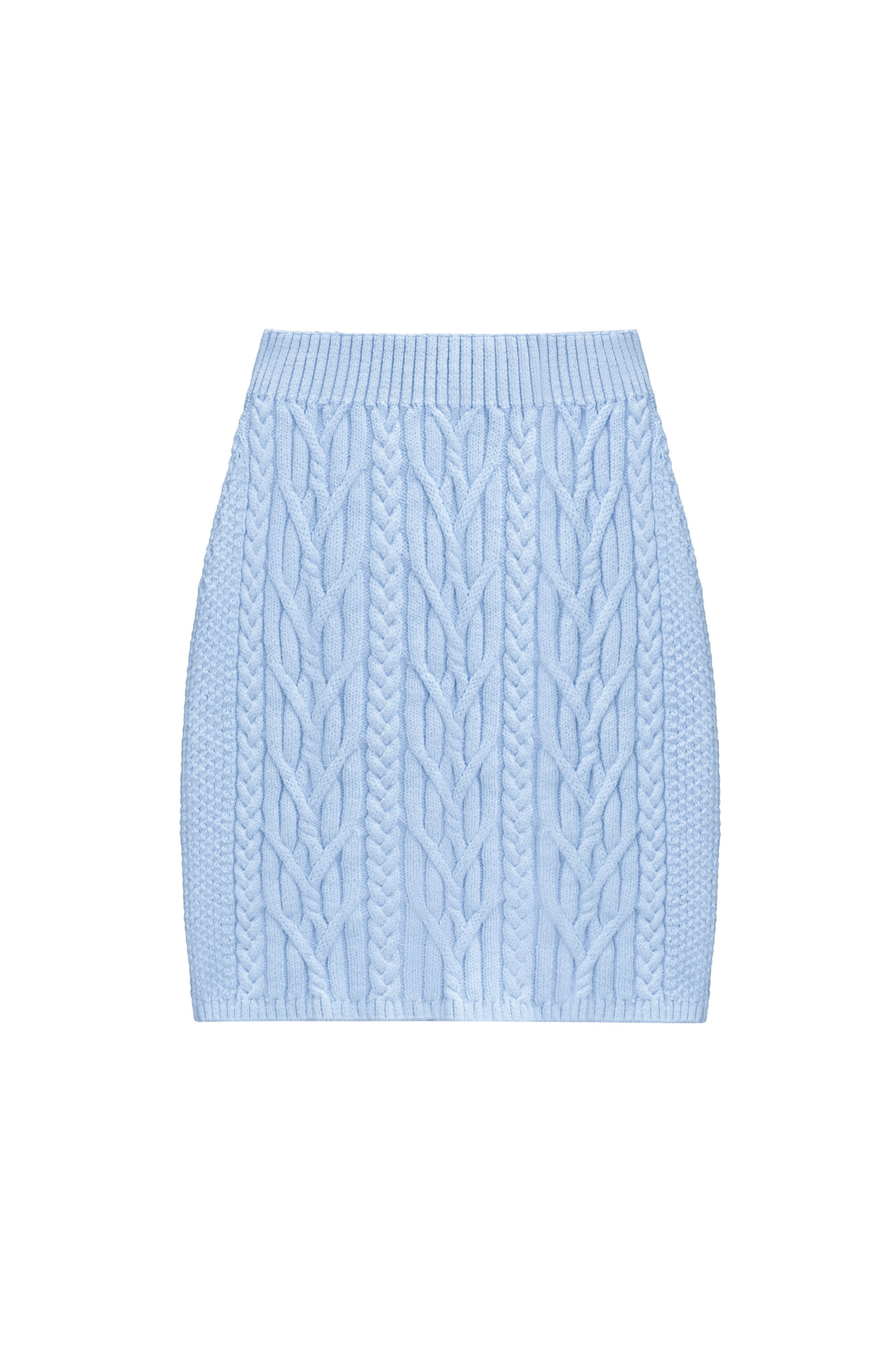 Трикотажная юбка длины мини из вискозы и хлопка. Модель с широким эластичным поясом. Изделие декорировано фактурной вязкой в виде кос разной толщины. Края выполнены в рубчик.
