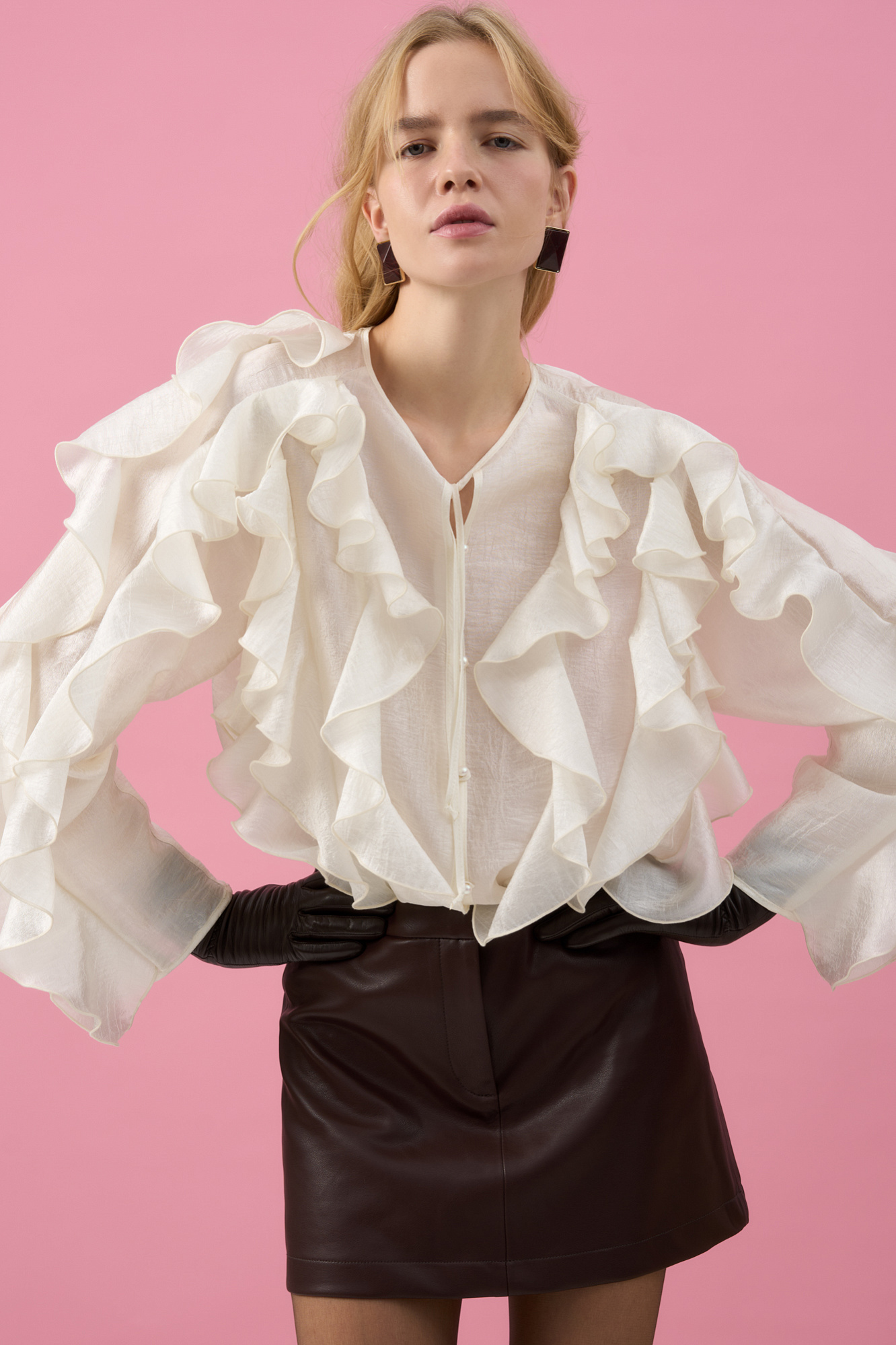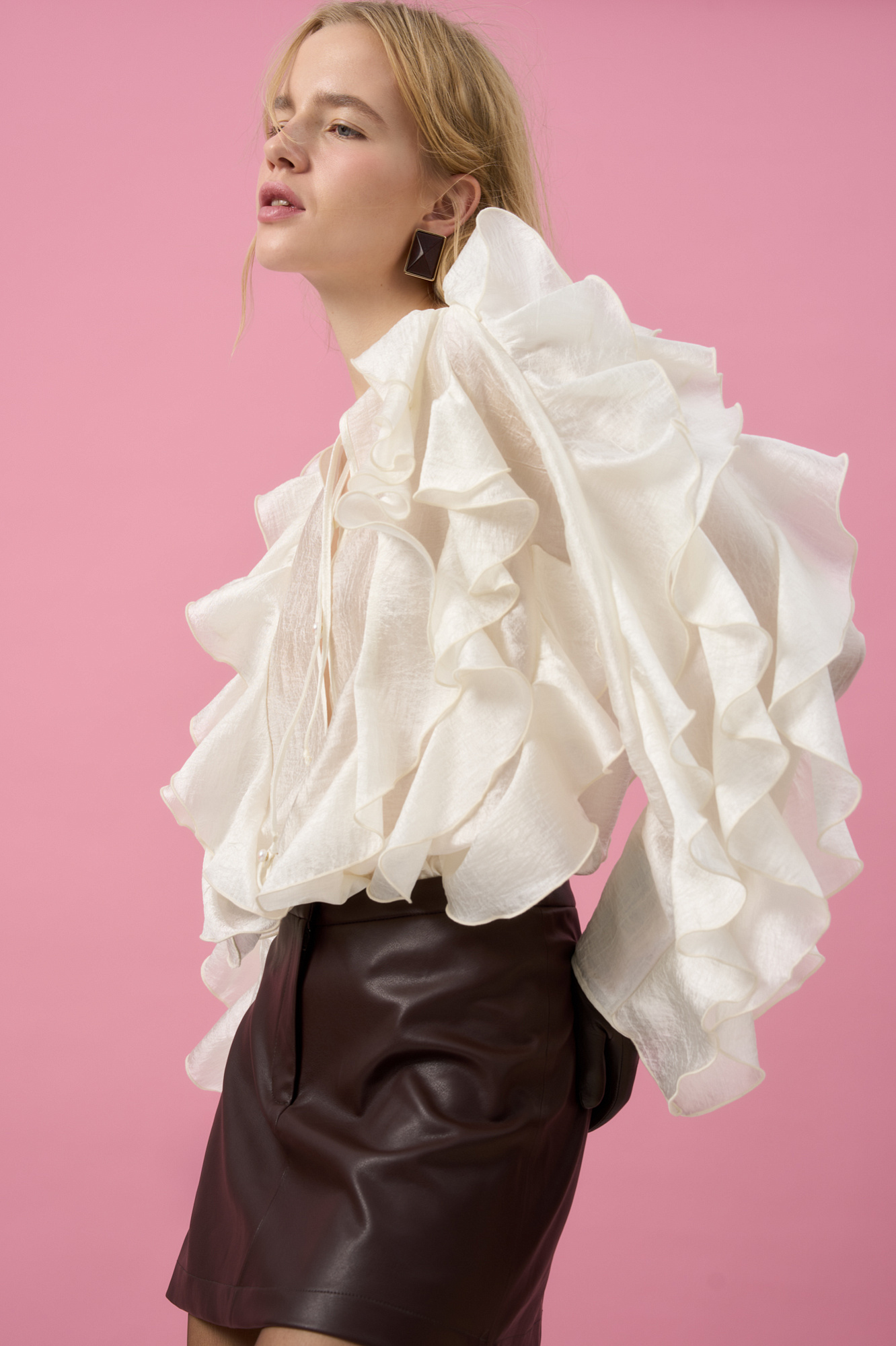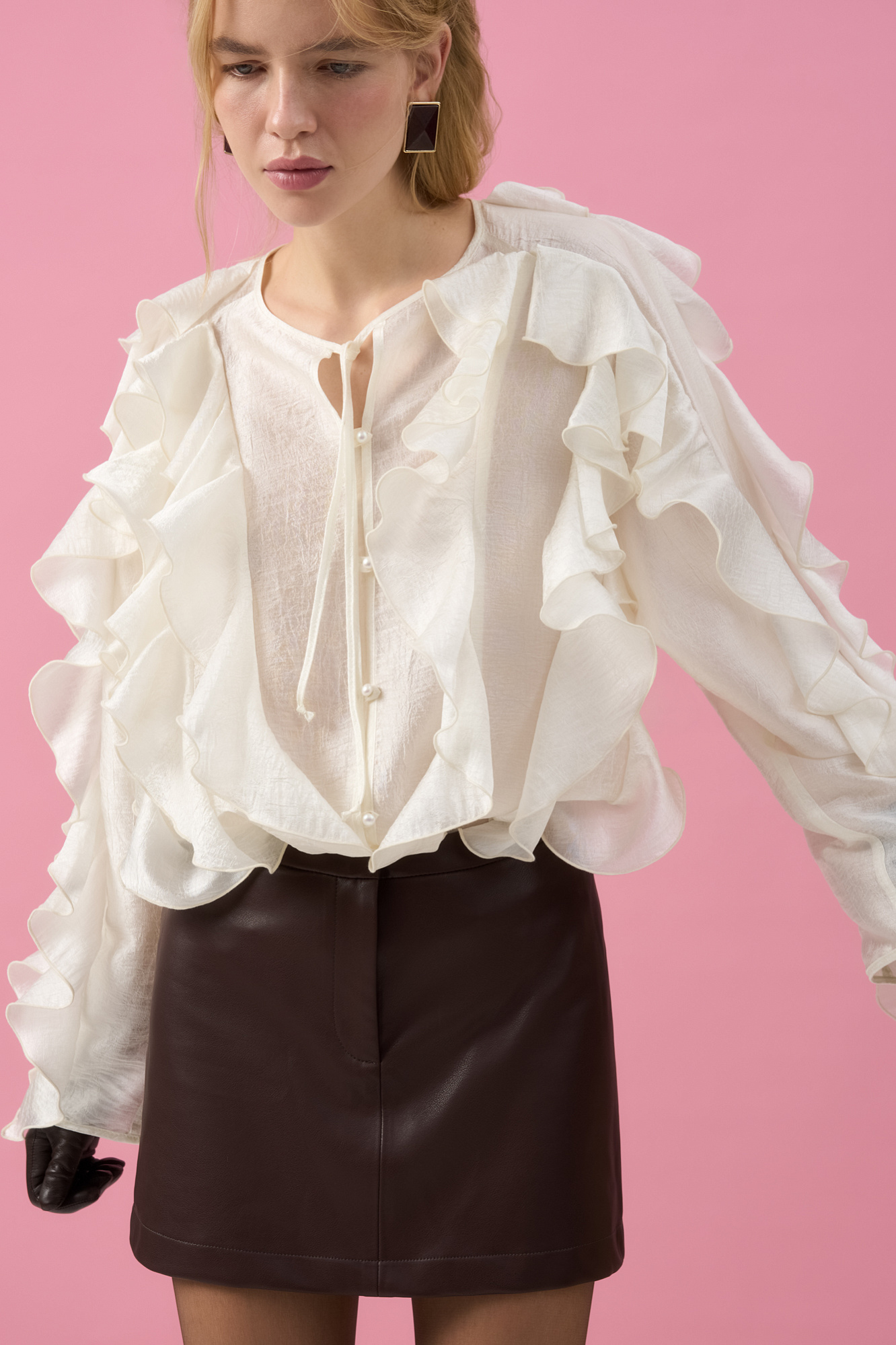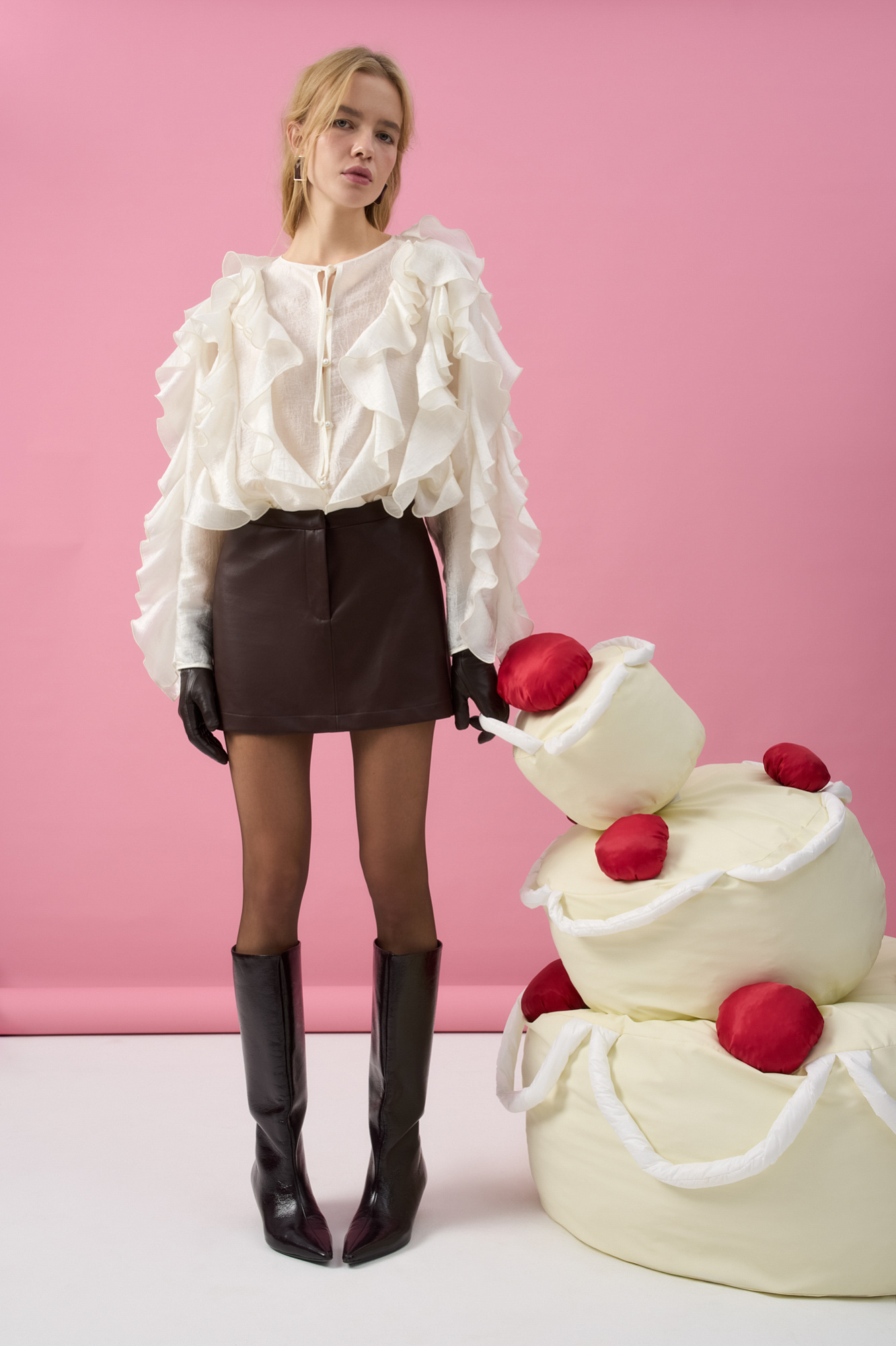 Юбка длины мини из экокожи. Модель выполнена на подкладке. Застежка на молнию, скрытые пуговицу и крючок.