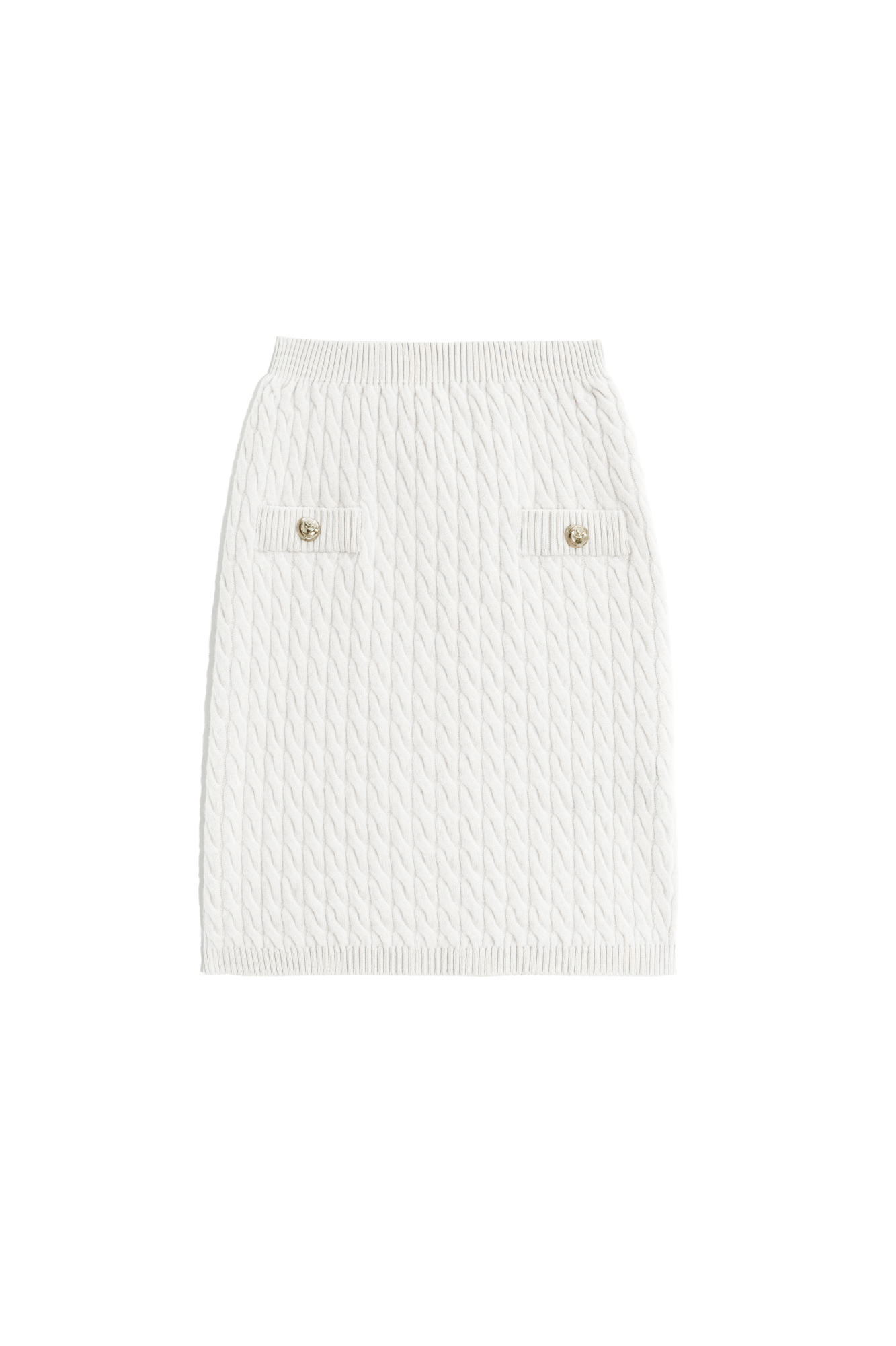 Юбка длины мини из 100% шерсти мериноса экстрафайн, выполненная вязкой косами. Модель по фигуре с эластичным поясом в рубчик. Имитация карманов с клапанами. Изделие декорировано крупными акцентными пуговицами.