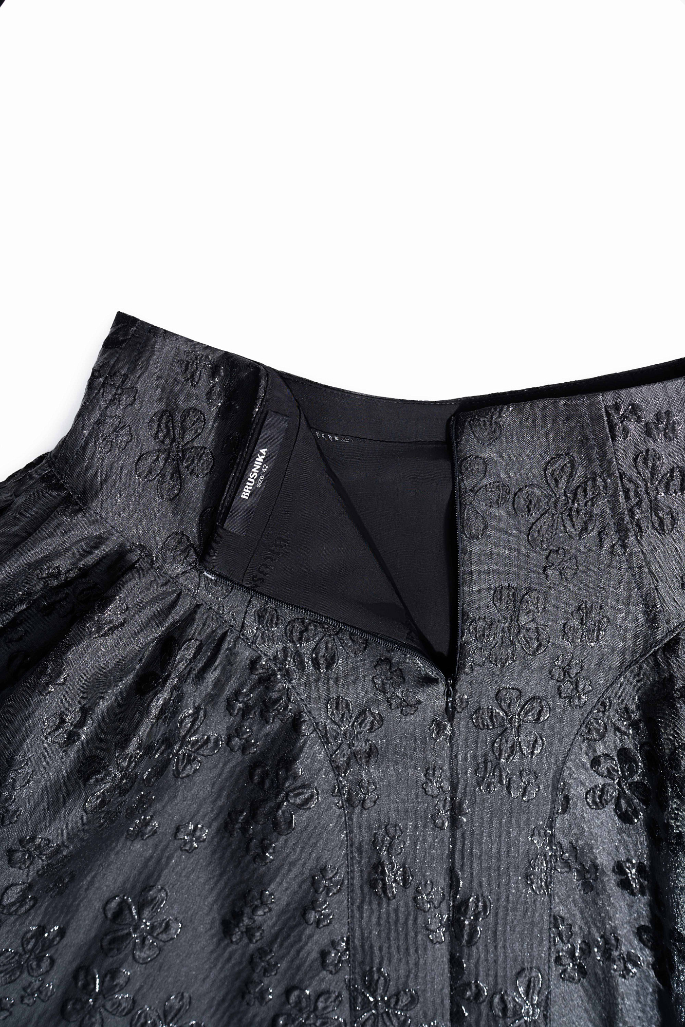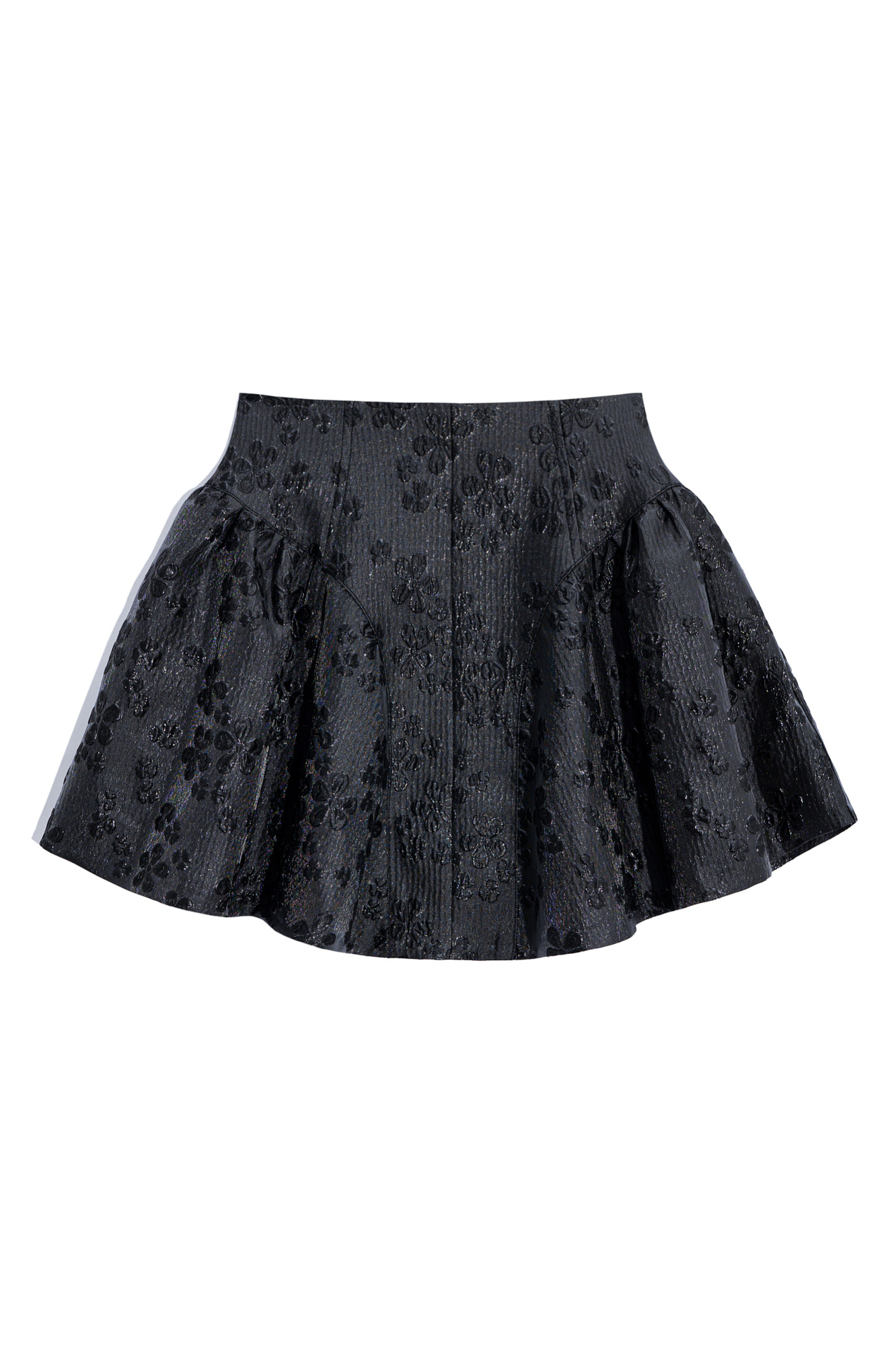 Юбка-баллон длины мини, выполненная из жатого жаккарда с растительным орнаментом. Модель с высокой талией и застежкой на скрытую молнию сзади. Изделие на подкладке.